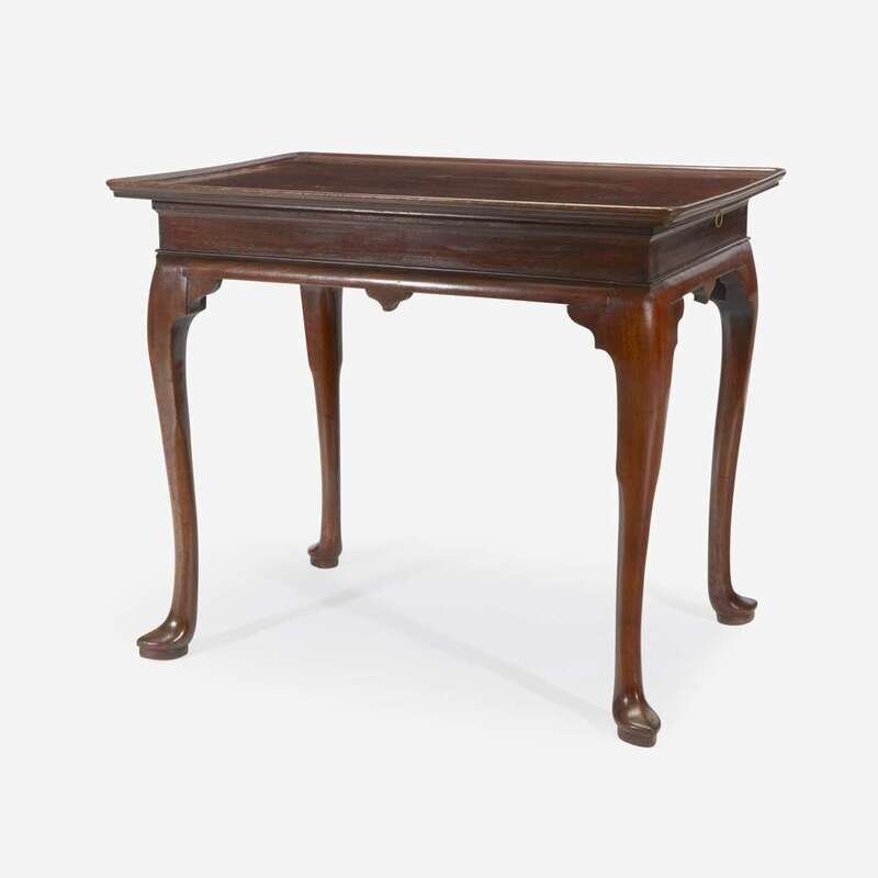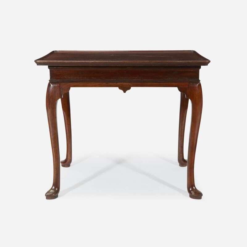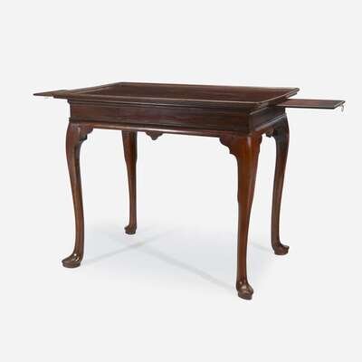 Dished rectangular top, with two candle slides, cabriole legs on elevated slipper feet.
