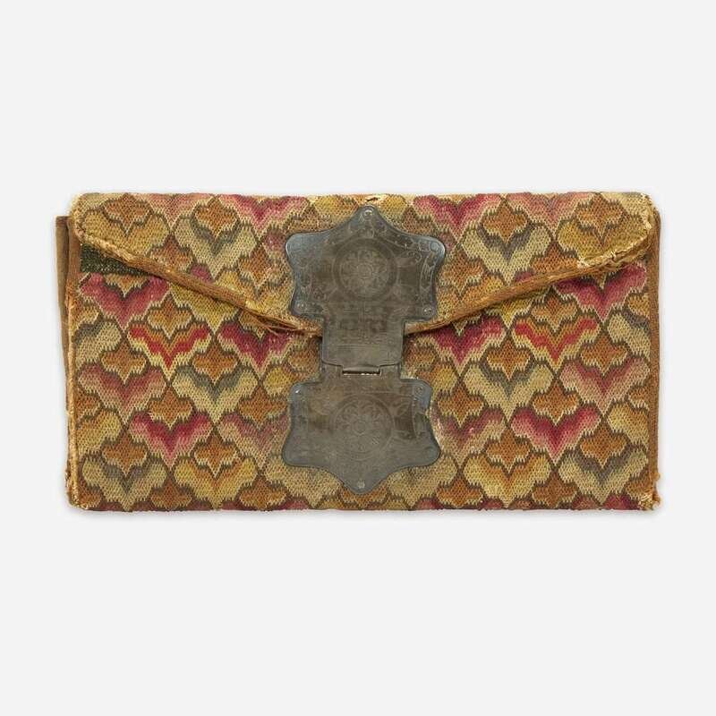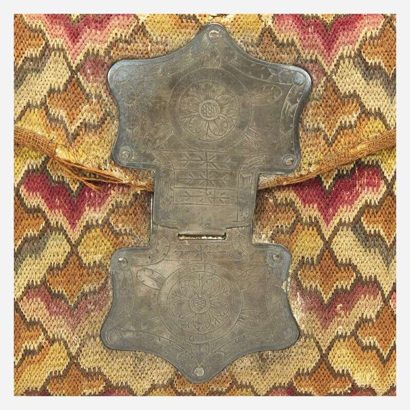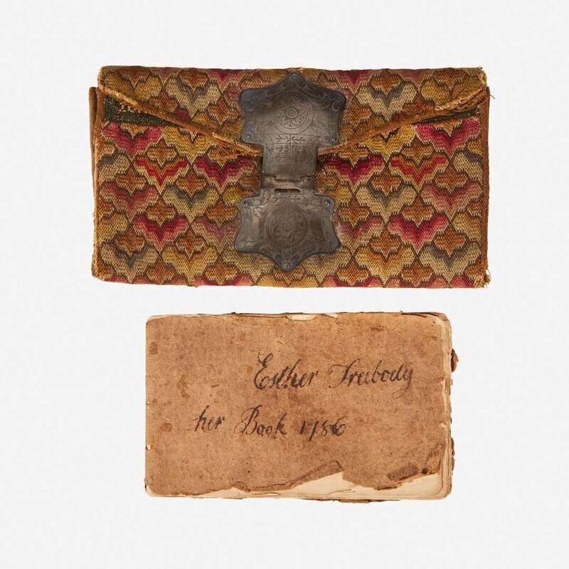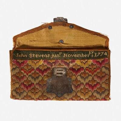 Worked with polychrome wool yarns in an overall carnation pattern, and closing with engraved shaped silver clasp, the interior bearing the name, "John Stevens junr November 19, 1774"; together with a tune book with paper wrappers inscribed in ink, "Esther Freebody/her book 1786," with four pages of handwritten music.