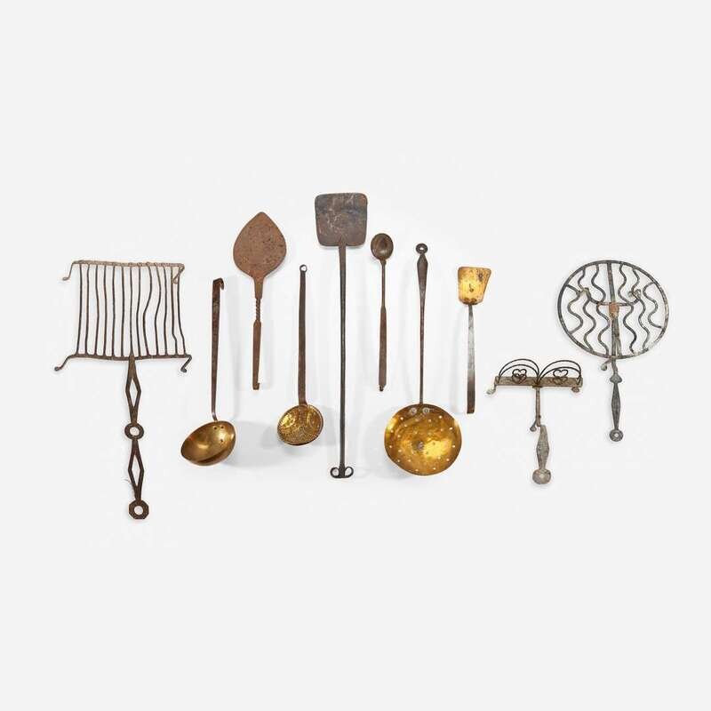 Including a rotating toaster with heart devices; a large gridiron or broiler with pierced handle; a rotating grill with shaped handle; an iron and brass spatula; two strainers and ladle; and wrought iron peel, small ladle and spatula. Brass and iron spatula and ladle impressed with mark of F. B. Smith, Canton, Ohio.