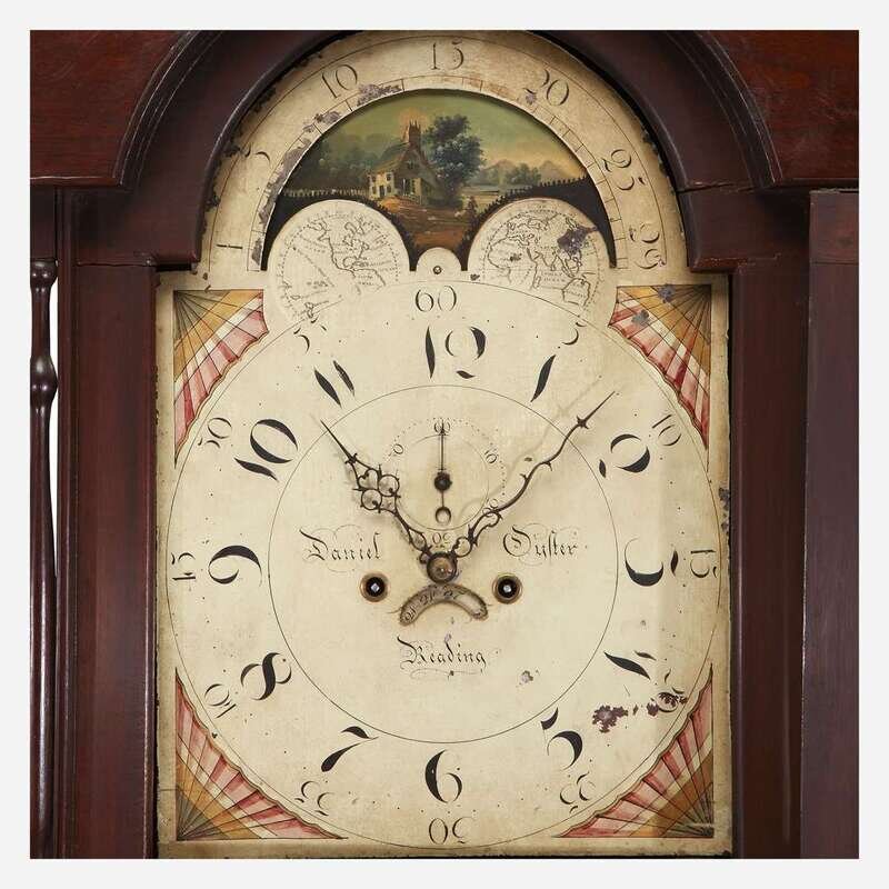 Enamel painted face, inscribed "Daniel Oyster Reading," with dial decorated with rural scene with house.