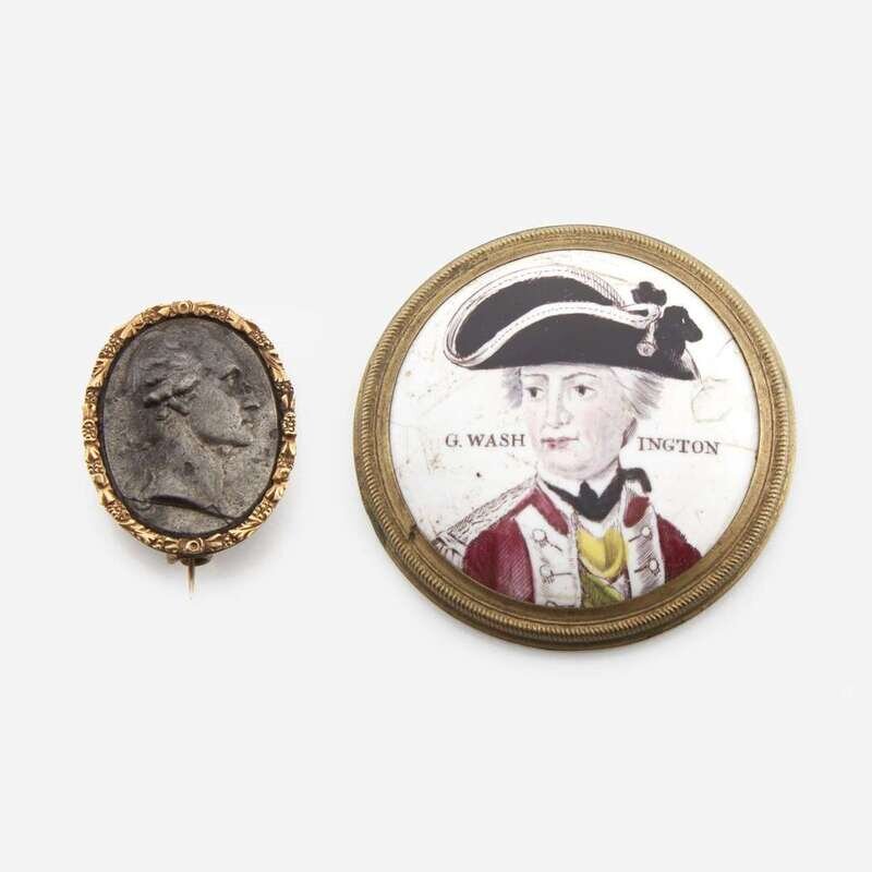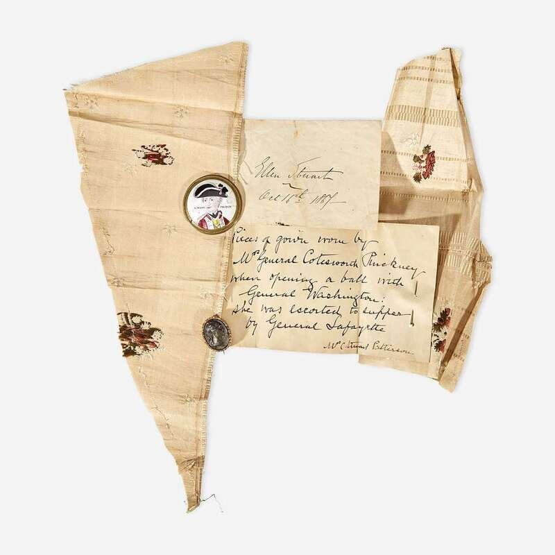 Including an enameled rondel depicting a polychrome portrait of "G. Washington" in uniform; a Berlin casting memorial brooch of Washington, engraved "F.B.F. to E.P."; and two gown fragments identified by accompanying hand-written note, "Pieces of gown worn by/ Mrs. General Cotesworth Pinckney/ when opening a ball with/ General Washington:/ she was escorted to supper/ by General Lafayette./ Mrs. C. Stuart Patterson."