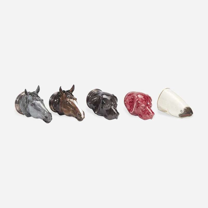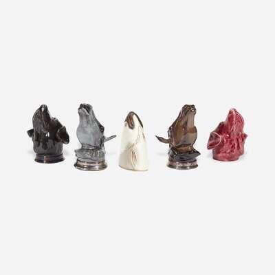 A group of five English Staffordshire animal-form stirrup cups Royale Stratford and others, 19th and 20th century