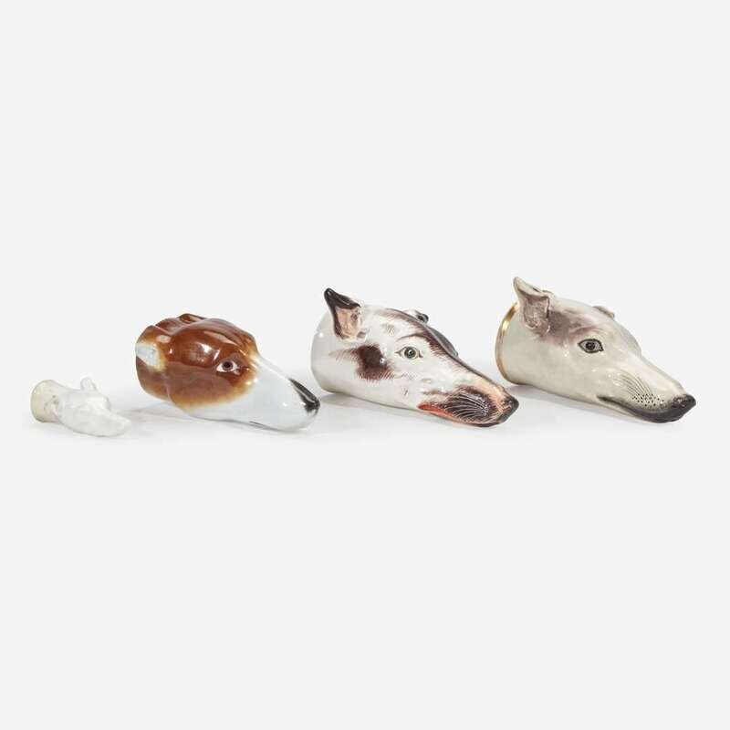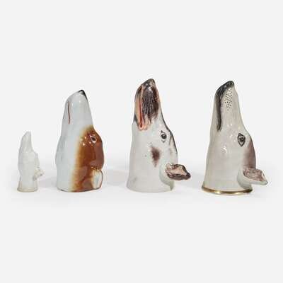 A group of four English greyhound-form porcelain or pearlware stirrup cups Staffordshire, and others, 19th century