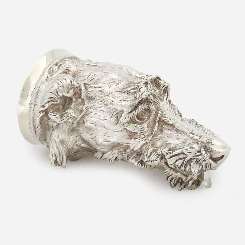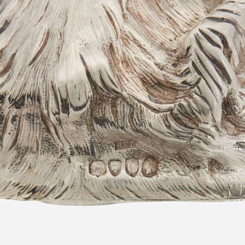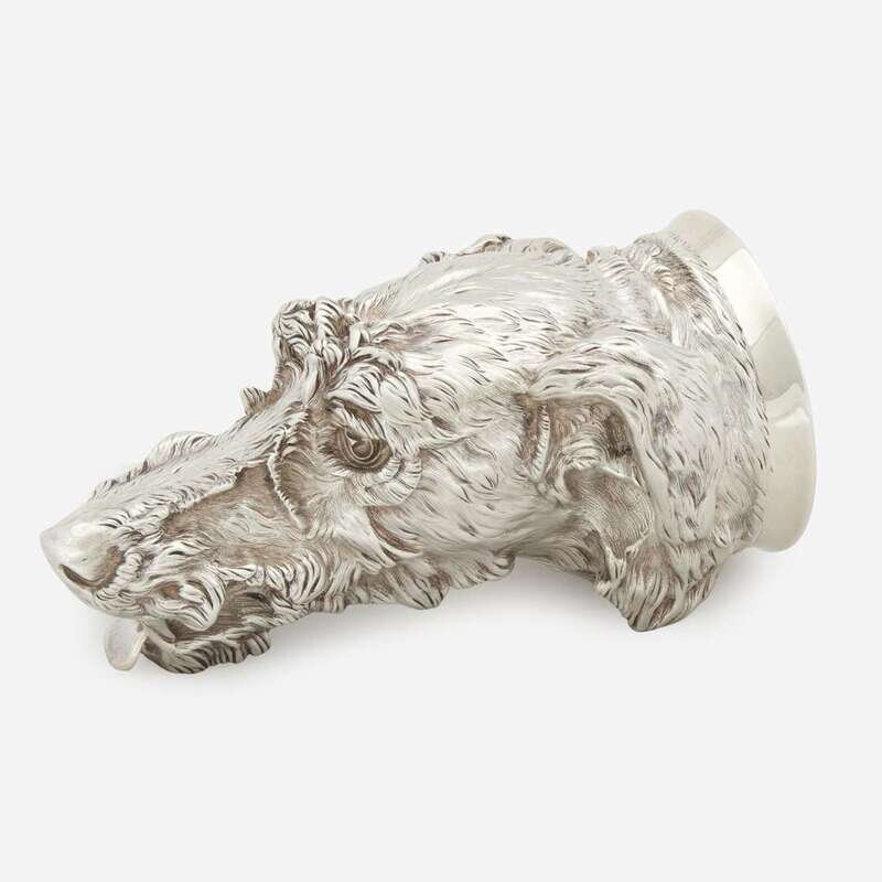 A Victorian sterling silver otter hound-form stirrup cup James Barclay Hennell, London, 1878