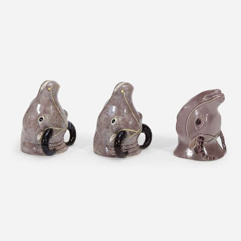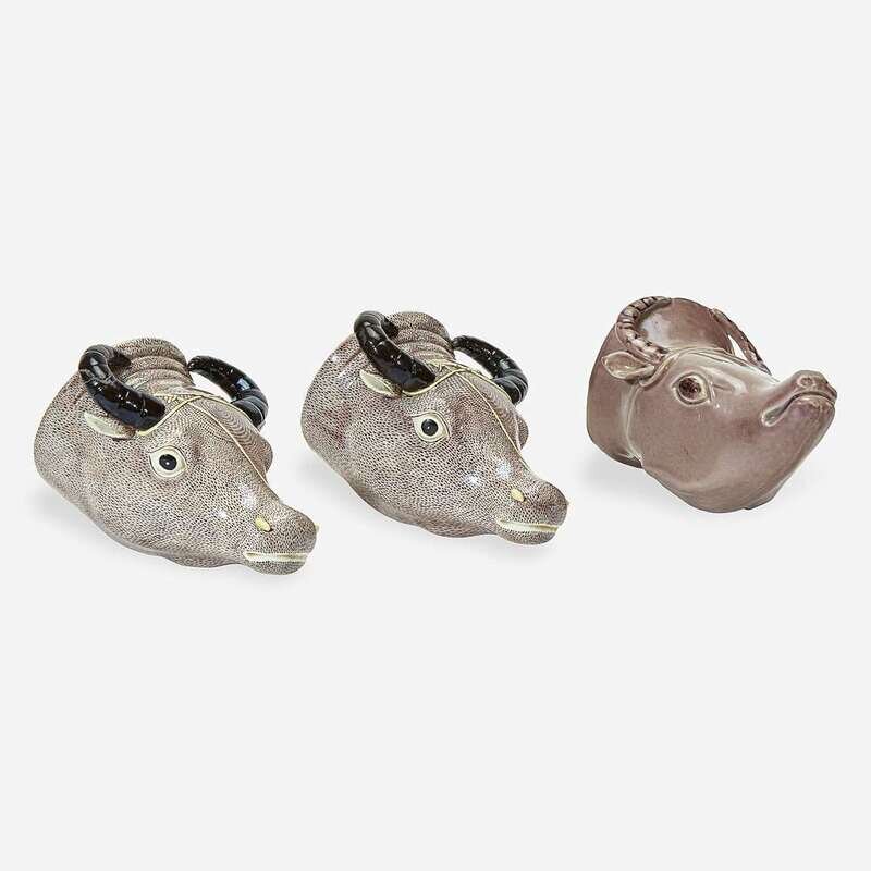 A group of three Chinese Export porcelain ox-form stirrup cups One, circa 1725, the pair 19th century