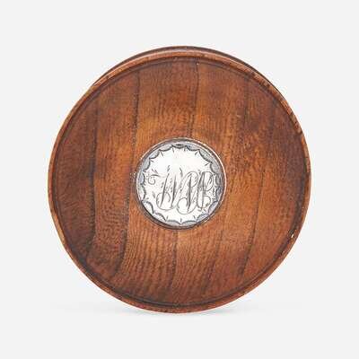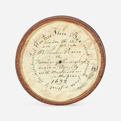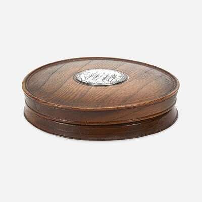 The lid set with a silver medallion engraved with monogram "WMP"; with paper label to interior, inscribed in ink, "This Box was made from a part of the celebrated Elm tree under the shade of which William Penn the Founder of Pennsylvania made a Treaty with the Indians in the year 1682."