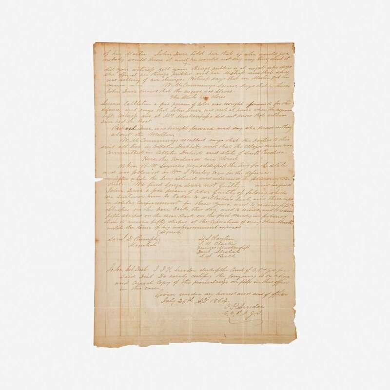 Colleton District, South Carolina, October 10, 1863-July 25, 1864. 1 pp., 16 1/4 x 10 3/4 in. (413 x 273 mm). MS. clerical copy of the court proceedings of the State of South Carolina v. "John Durr and George Durr free persons of color", charged with aiding another free person of color, William Durr, who assisted an enslaved woman, Sally, and her two children, Manda and Allen, in their escape to the North from the enslavement of George Muckinfuss. The document outlines the charges against them, as well as contains witness testimony and verdicts. Presumably removed from a court ledger; scattered chipping; loss at top affecting a few words; sello tape repair along center.