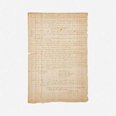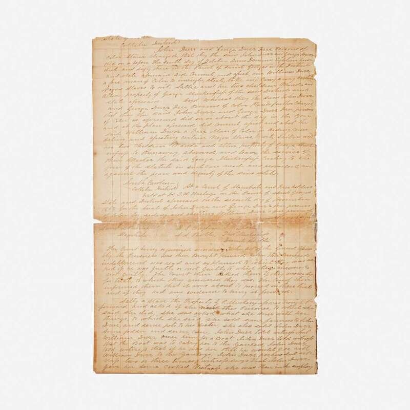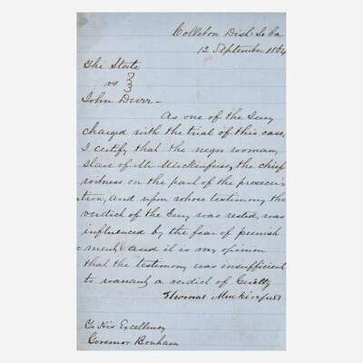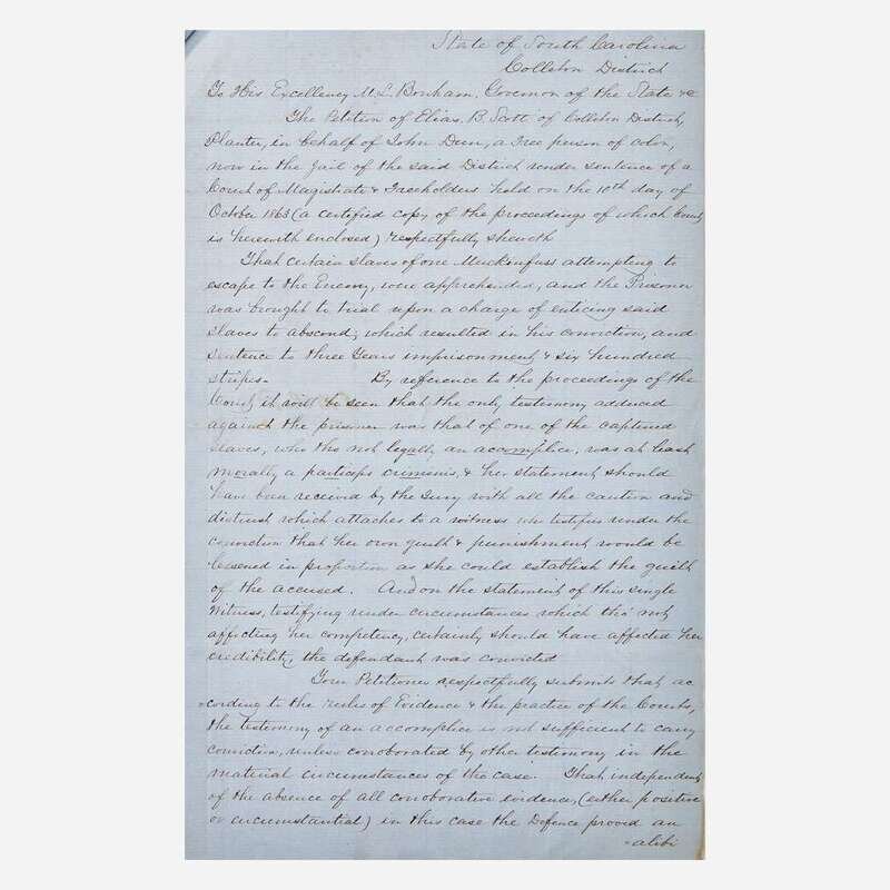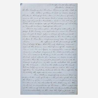 A rare group of documents created in a successful effort to commute the sentence of a free black man incarcerated for aiding an enslaved family's escape to the North. John and George Durr, free persons of color, stood accused of aiding free person of color William Durr in his involvement helping an enslaved family escape by boat to the North. The prosecution's case rested solely on the testimony of the enslaved mother, and while George Durr was found not guilty of the charges, John was found guilty. He was sentenced to "be taken to Walterboro jail, and there kept in solitary confinement for three years, and to receive fifty stripes on the bare back, this day, and to receive fifty stripes on the bare back on the first Monday in February, then to receive fifty stripes at the Expiration of every Three Months until the term of his imprisonment ends." An unfathomably cruel punishment of 600 lashes in total. John served 10 months of his sentence, receiving 200 lashes, before the prosecution's case fell apart after it was revealed that their sole witness was coerced by fear of violence into testifying against him. His sentence was eventually commuted by South Carolina Governor M.L. Bonham.