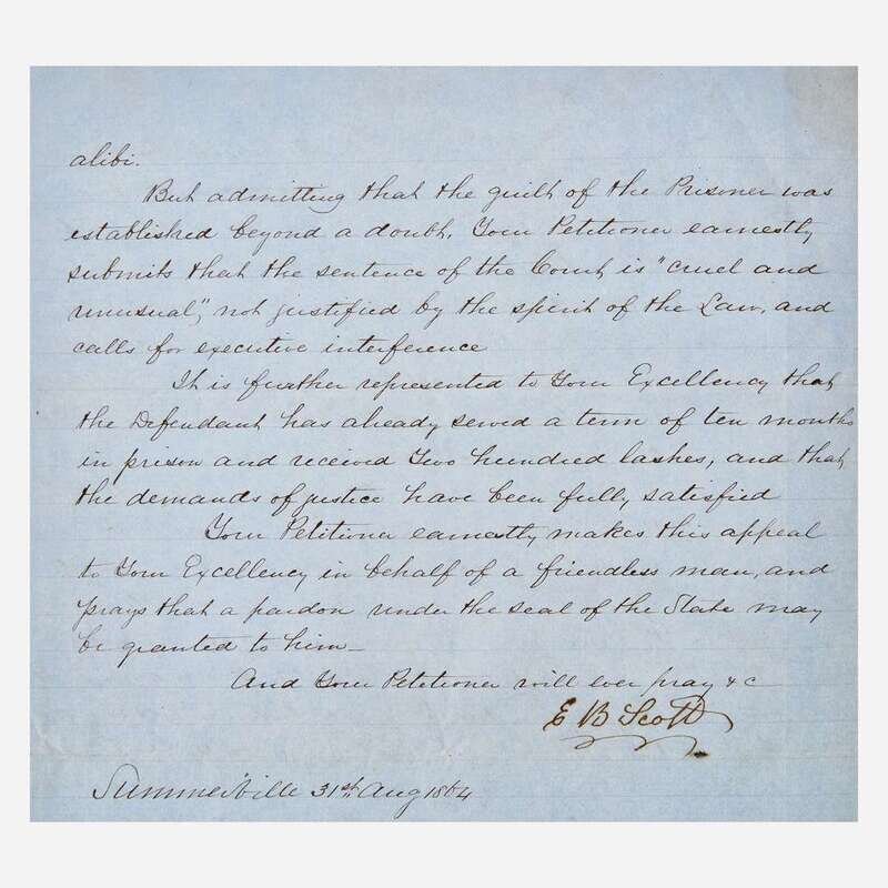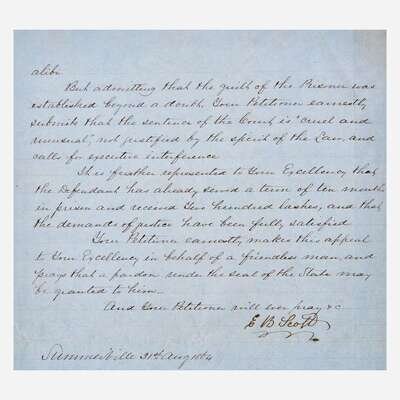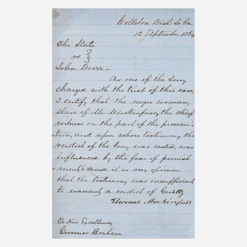 Colleton District, South Carolina, August 31, 1864. One page folded to make four pages; 13 1/4 x 8 3/4 in. (336 x 222 mm). Letter of appeal, written in a secretarial hand, and signed by planter E.B. Scott on behalf of prisoner John Durr, urging South Carolina Governonr, M.L. Bonham, to commute his sentence. Scott cites insufficient evidence produced by the State, as well as Durr's unconscionable sentence of 600 lashes plus three years in solitary confinement, calling it "cruel and unusual" and "not jusified by the spirit of the Law..." Affixed is a note, also in a secretarial hand, and signed by juror Thomas Muckinfuss (relative of slaveholder George). Written on behalf of Durr to Governor Bonham, stating that the prosecution's witness in the trial was coerced to testify against Durr under fear of punishment, and that the testimony is, in his opinion, "insufficient to command a verdict of guilt"; dated September 12, 1864.