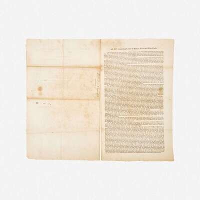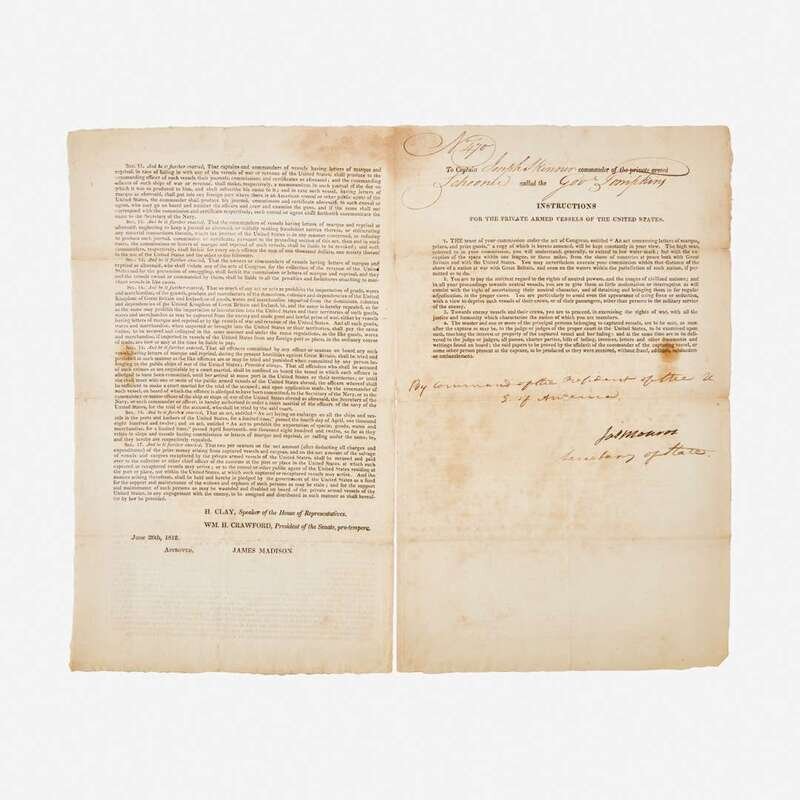(Washington, D.C.), ca. 1812. One sheet folded to make 4 pp.; 13 1/4 x 8 1/4 in. (336 x 209 mm). Partially-printed document issued at the beginning of the War of 1812, accomplished in a secretarial hand and signed by Monroe as Secretary of State, granting Joseph Kinner of the schooner Gov. Tompkins a letter of marque and reprisal, and containing "Instructions for the Private Armed Vessels of the United States". Creasing from original folds; separating along center fold, a few other small separations along folds; scattered light foxing. Lot includes a printed portrait of Monroe.