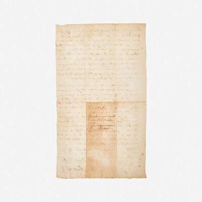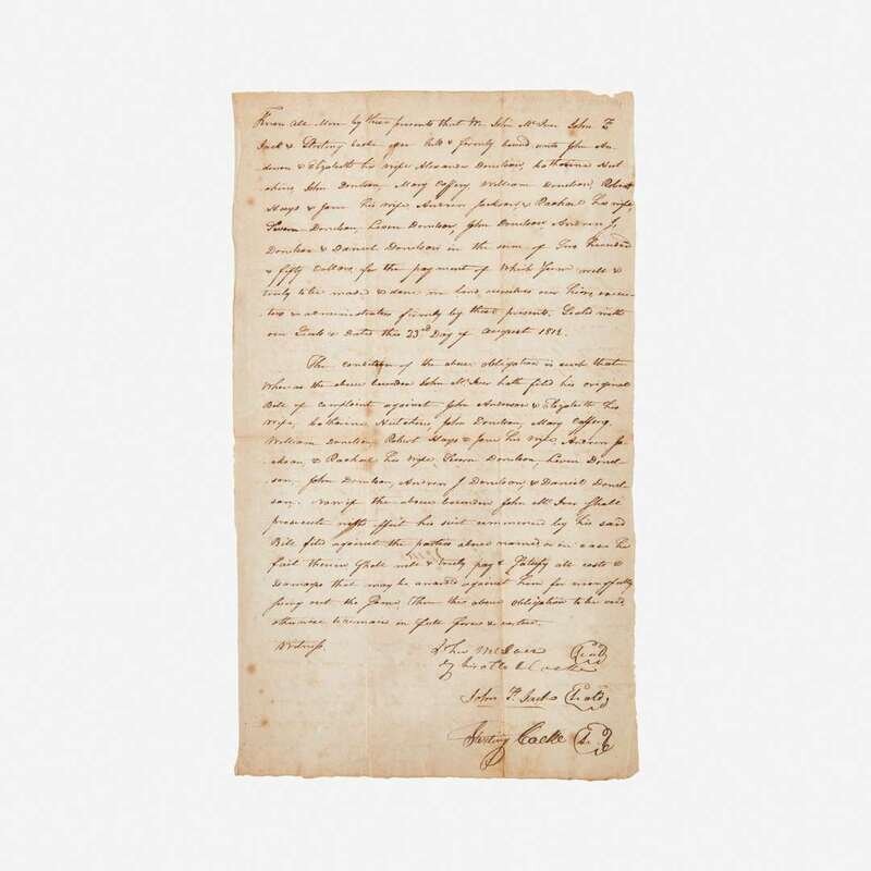 (Tennessee), August 23, 1812. One sheet; 13 1/4 x 7 3/4 in. (336 x 197 mm). Manuscript bond, signed in a secretarial hand, relating to a lawsuit by a Mr. John McIver, John F. Jack, and Sterling Cocke, against Andrew and Rachel Jackson, as well as John and Elizabeth Anderson, Catherin Hutchins, John Donelson, Mary Coffery, William Donelson, Robert and Jane Hayes, Severn Donelson, Leven Donelson, John Donelson, Andrew J. Donelson, and Daniel Donelson: "The condition of the above obligation is such that/whereas the above bounden John McIver hath filed his original/Bill of Complaint against John Anderson & Elizabeth his wife...Andrew Ja/ckson & Rachel his wife...now if the above bounden John McIver shall/prosecute with effect his suit commenced by his said/Bill filed against the parties above named..."; docketed on veso. Creasing from original folds.