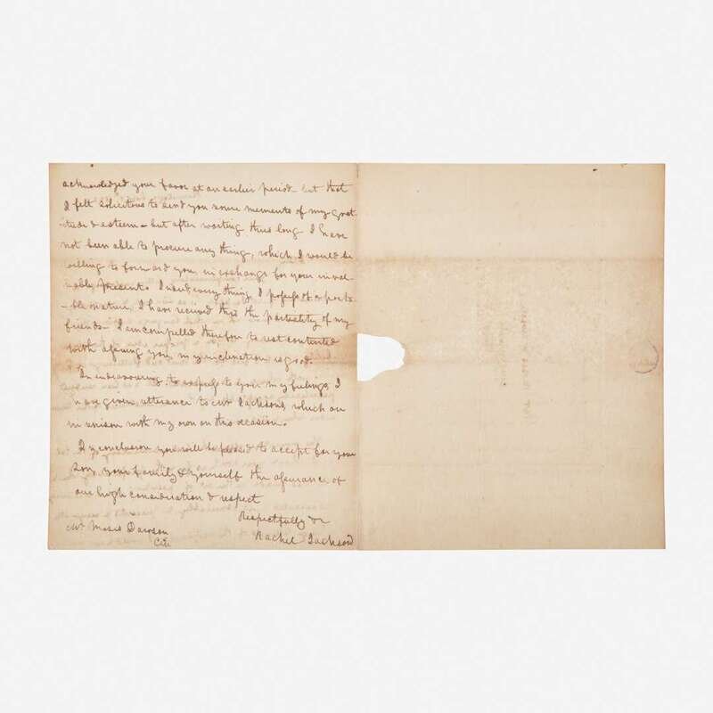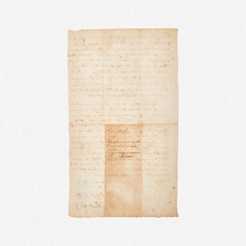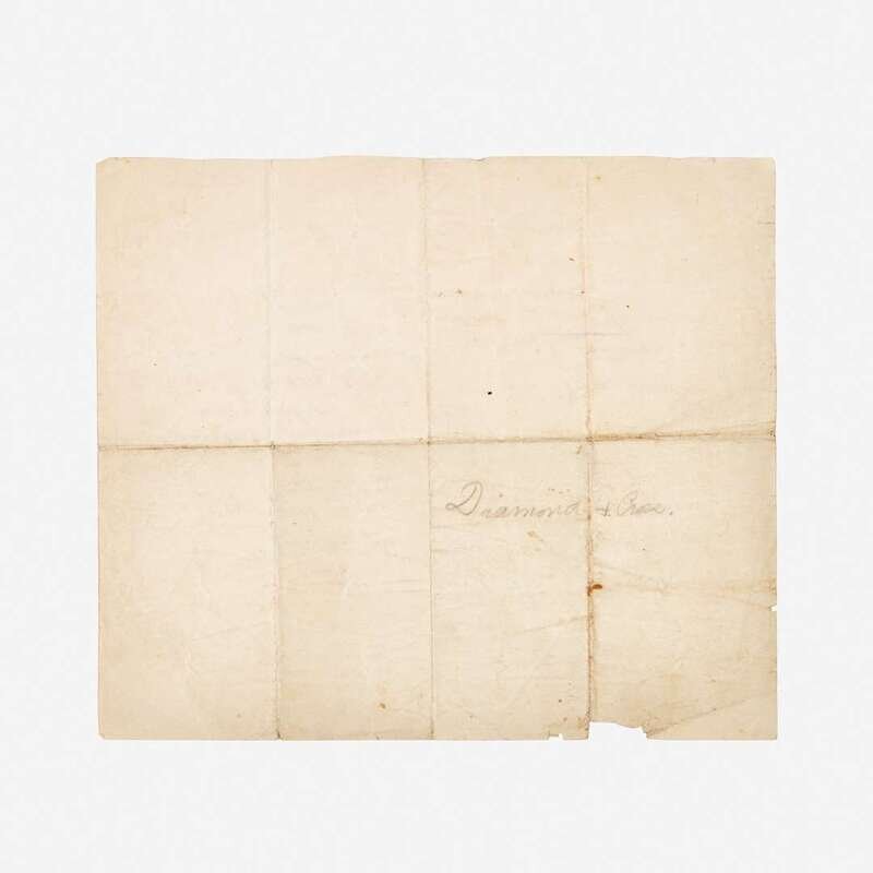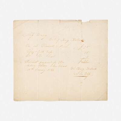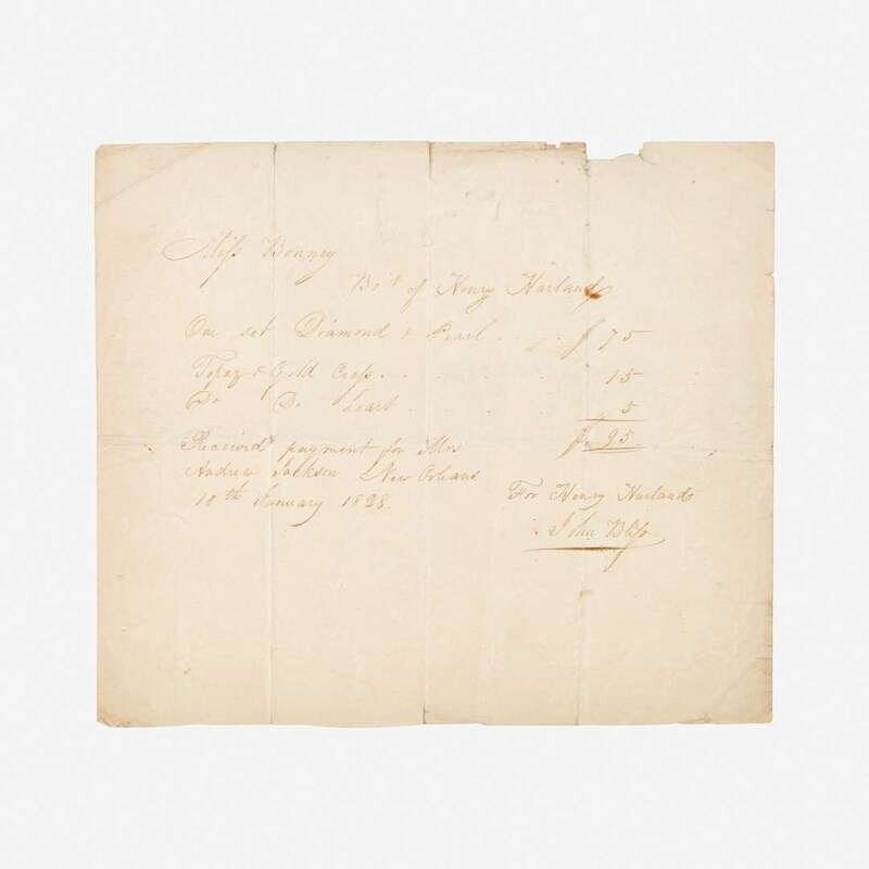 New Orleans, January 10, 1828. One sheet; 6 3/4 x 7 7/8 in. (171 x 200 mm). Manuscript receipt, signed, in an unknown hand: "Miss Bonney/Bo't of Henry Harland/One set Diamond & Pearl...$75/Topaz & Gold Cross...15/" " Heart...5/$95/Received payment for Mrs/Andrew Jackson New Orleans/10th January, 1828/For Henry Harland/John Bliss" Creasing from original folds; chipping along top edge.
