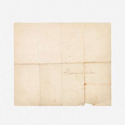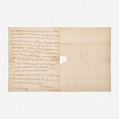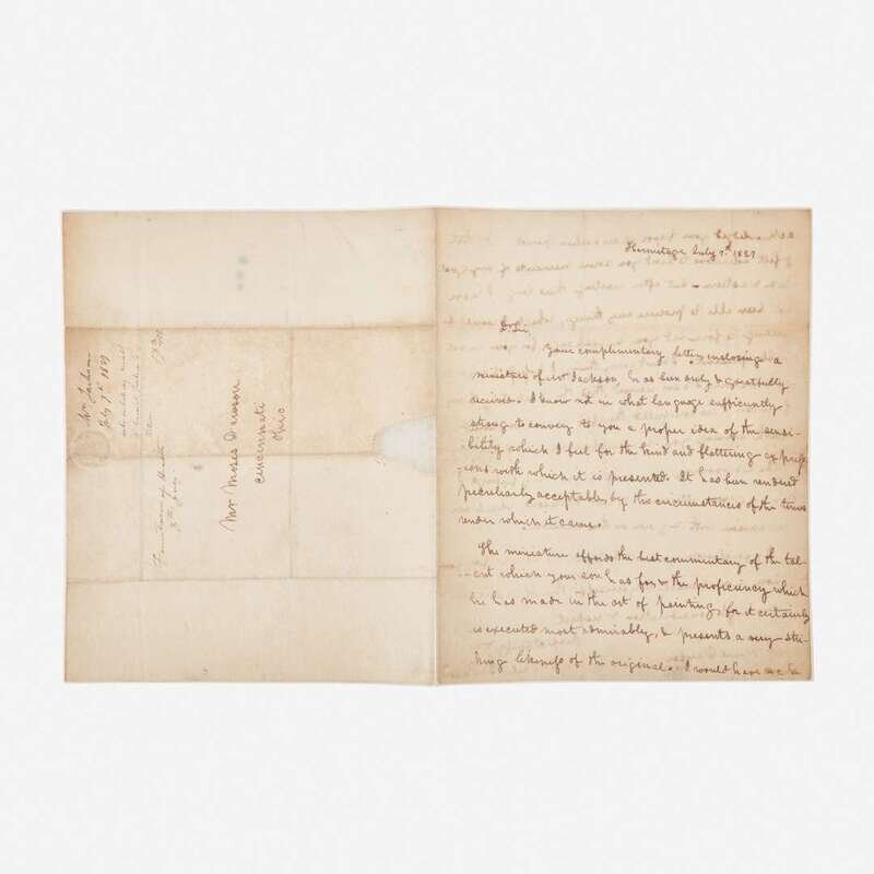 Hermitage, July 7, 1827. One sheet folded to make 4 pp.; 9 7/8 x 7 7/8 in. (251 x 200 mm). Autograph letter, signed by Jackson, to Mr. Moses Dawson of Cincinatti, Ohio, acknowledging the receipt of a painting of Andrew Jackson: "Your complimentary letter enclosing a/miniature of Mr. Jackson, has been duly & greatfullly/received. I know not in what language sufficiently/strong to convey to you a proper idea of the sensi/bility which I feel for the kind and flattering express/ions with which it is presented. It has been rendered/peculiarly acceptable, by the circumstances of the times/under which it came./The miniature affords the best commentary of the tal/ent which your son has for & the proficiency which/he has made in the art of painting, for it certainly/is executed most admirably, & presents a very stri/king likeness of the original...In endeavouring to express to you my feelings, I/have given utterance to Mr. Jackson, which are/in unison with my own on this occasion./In conclusion you will be pleased to accept for your/son, your family & yourself the assurance of/our high consideration & respect."; address made out by Jackson on verso; docketed by Dawson on same. Silked; creasing from original folds.