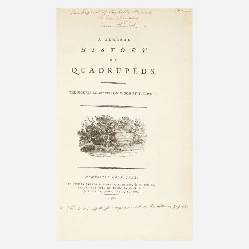 Newcastle Upon Tyne: S. Hodgson, R. Beilby, & T. Bewick, 1790. First edition. Tall 8vo. viii, 456 pp. Inscribed at top of title-page: "The bequest of Isabella Bewick/to her Daughter/Jane Bewick " either partially or completely by Thomas Bewick's wife, Isabella, or their daughter, Jane. There is a further inscription at bottom of same, "* This is one of the four copies printed on this vellum paper." and appears to be signed with Thomas Bewick's cipher, "TB". As a close reading of T. Roscoe's bibliography of Bewick (p. 6) will attest, Thomas Bewick was well aware of the outsized value of some of his books, including this very one. Profusely illustrated with wood engravings by Bewick. Contemporary tree calf, stamped in gilt, rebacked, early red morocco spine label laid down; all edges gilt; marbled endpapers; pencil rubbing of original (?) spine laid in; ink and pencil pattern of a different spine laid in; book-plate on front paste-down. Roscoe 1, see "Special Copies", p. 6.