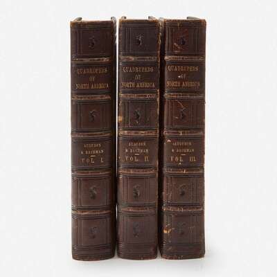 New-York: V.G. Audubon, 1854. In three volumes. Second octavo edition. 8vo. viii, 383, (1); (iv), 334; (ii), 348 pp. Half-titles in each volume. Illustrated with 155 hand-colored lithographic plates by J.T. Bowen, from drawings on the stone by William E. Hitchcock and R. Trembley, after drawings by J.J. and J.W. Audubon (with tissue guards; some torn and dampstained). Contemporary full brown morocco, elaborately stamped in blind, spine titled in gilt, joints and extremities rubbed; all edges gilt; front hinge split, binding from text block in each volume; scattered minor foxing and soiling to text and plates; light offsetting from plates; bottom of front blank in second volume torn away. Sabin 2638