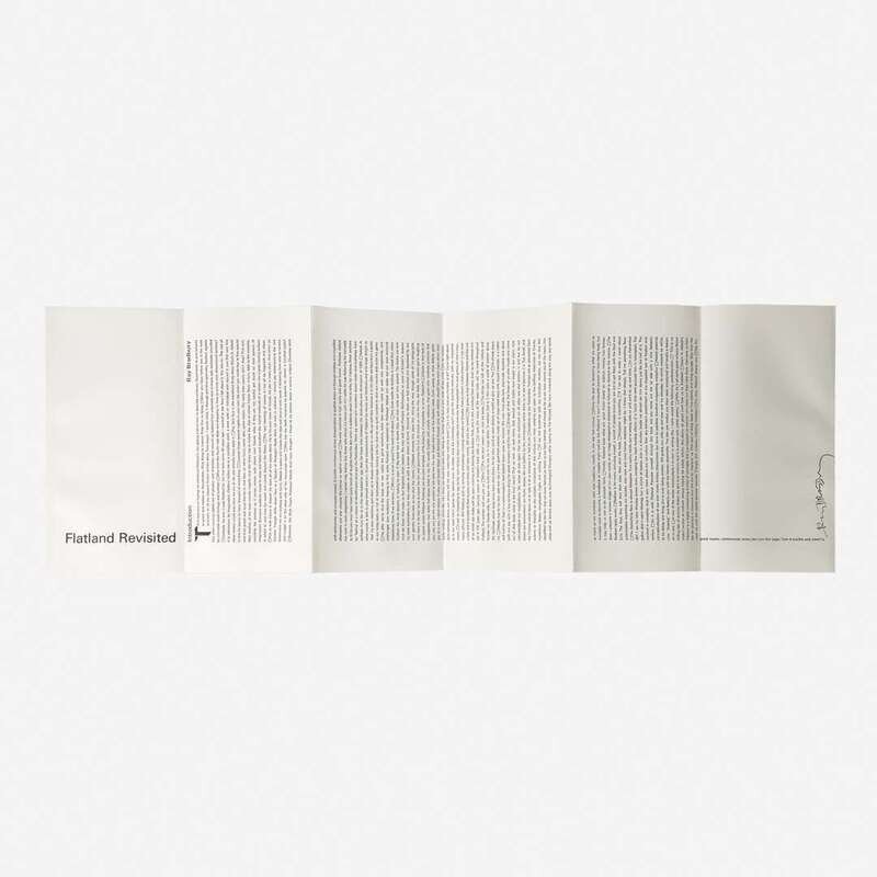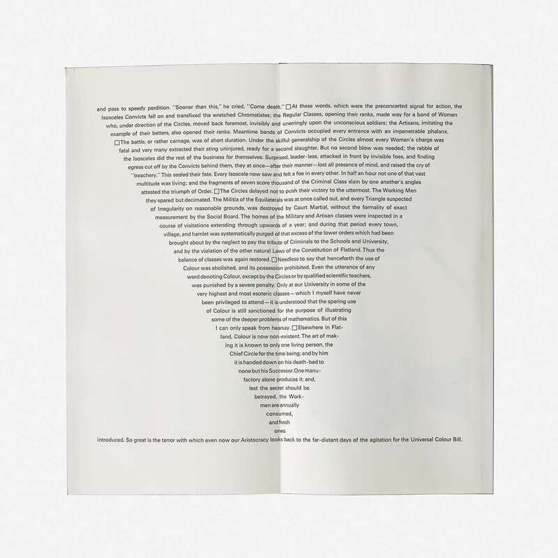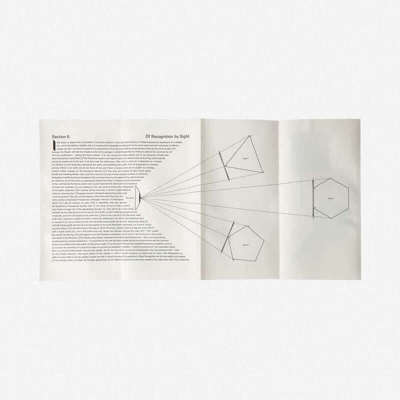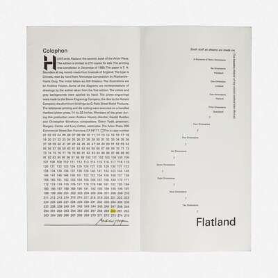 Arion Press's seventh publication. A scarce and clever rendition of Edwin Abbott Abbott's mind-bending mutlidimensional satire. Bound accordian style, each segment can be read as a square, and when opened measures 33 ft. per side.