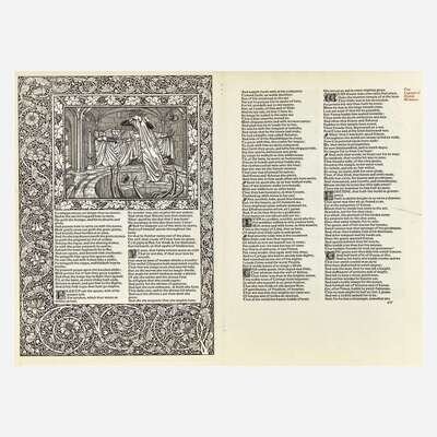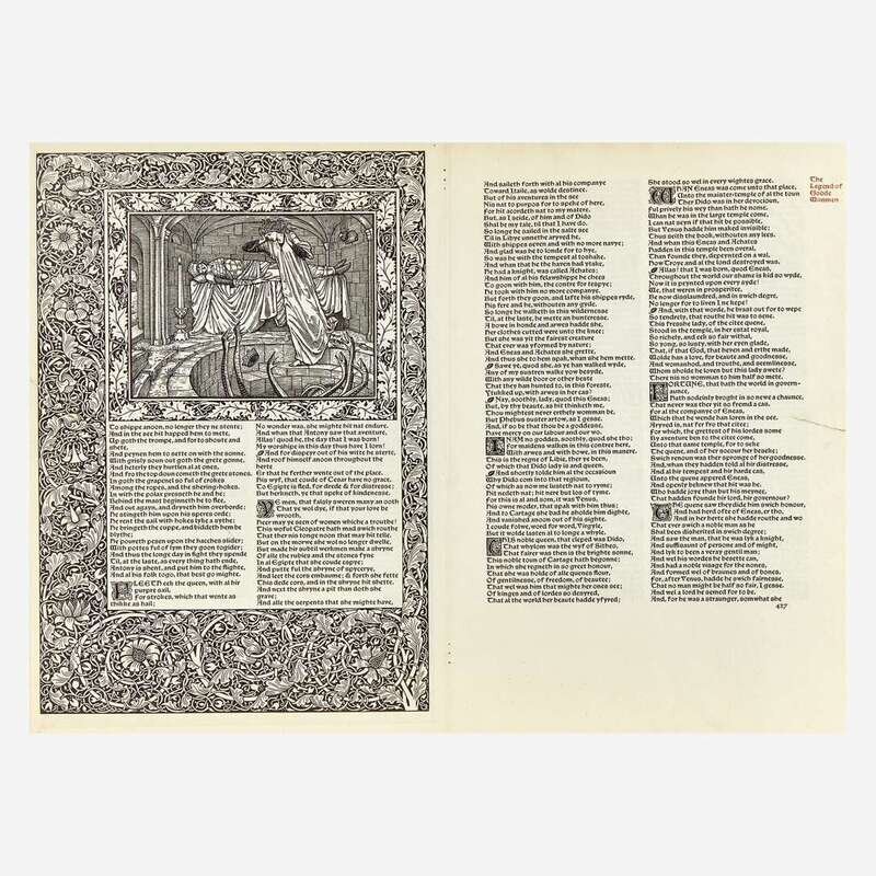 (Hammersmith: Kelmscott Press, 1896). Approximately 15 3/4 x 21 1/2 in. (400 x 546 mm). Printed bifolium leaf from The Works of Geoffrey Chaucer, comprising pp. (421/422) and 427/428 from The Legend of Goode Wimmen. Illustrated with one full page woodcut illustration on recto, large black and white initial on verso, ornately decorated border on recto and verso, and smaller initials in black and white; text in double column. 2 1/4 in. discreet closed tear in fore-edge pp. 427/428, short tidemark along bottom edge of same; repaired closed tear in fore-edge of pp. (421/422); edges darkened. Hinge-mounted, in mat and in frame (21 1/4 x 27 1/4 in.; 540 x 692 mm).