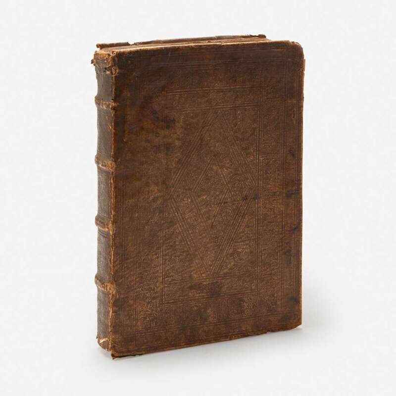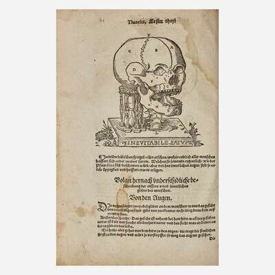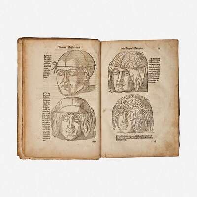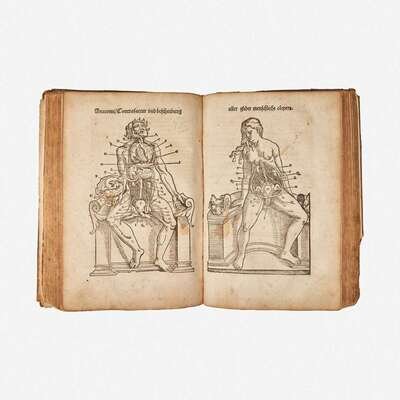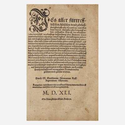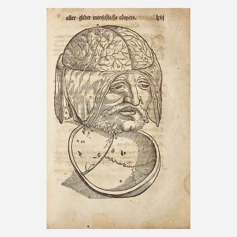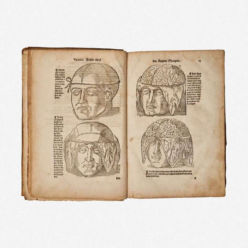 (Strassburg: Balthassar Beck, 1541). First edition. 4to. ff. 80; A-M6, N7, 1 blank (collates complete as compared with the copy in the New York Academy of Medicine Library). Illustrated with 26 full-page anatomical woodcuts (including seven depicting brain surgery), as well as 16 smaller in-text anatomical woodcuts (including one schematic of the eye); of the only two complete copies to come to auction since 1967, both called for only 25 full-page plates. Contemporary full "limp" pigskin (boards composed of pressed waste paper), elaborately stamped in blind, extremities worn, boards rubbed, spine ends chipped and worn, bottom rear corner heavily worn with loss to leather and exposing waste paper; modern endpapers; front and rear hinges worn and splitting; repaired short closed tears along bottom edges of ff. 5-7, 11-14, 37, 41-43, 60, 71; six-inch closed tear bottom ff. 56, crudely repaired at bottom; scattered short closed tears along edges; scattered soiling to text; scattered dampstaining at edges. Garrison and Morton, Fifth edition, 373.1. Extremely rare.