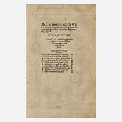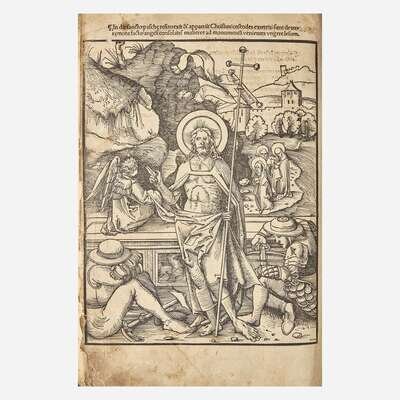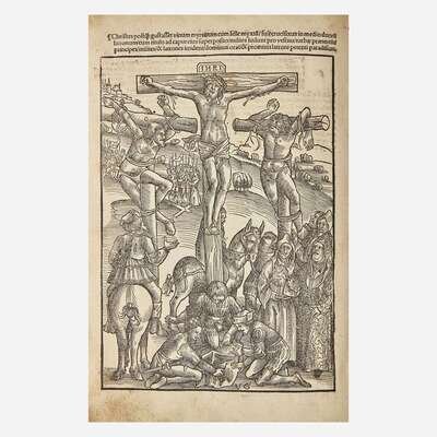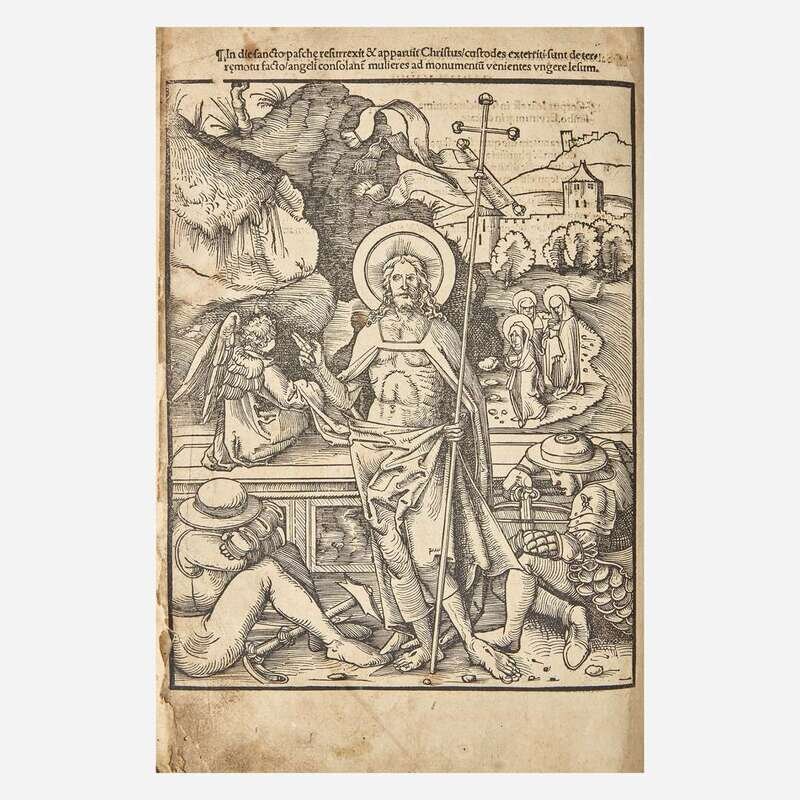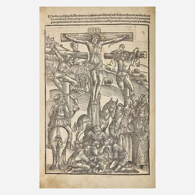 [Strassburg]: Joannes Knoblouchus, 1508. Fourth edition. 30 leaves; A-E6. Illustrated with 25 full-page woodcuts by Urs Graf and Hans Wechtlin. Fore-edge of most leaves worn, with loss to first four leaves, but not affecting text or plates; small worming at bottom of most leaves; repair at fore-edge of ff. 27; edges of final leaf crudely repaired; soiling to text and plates.