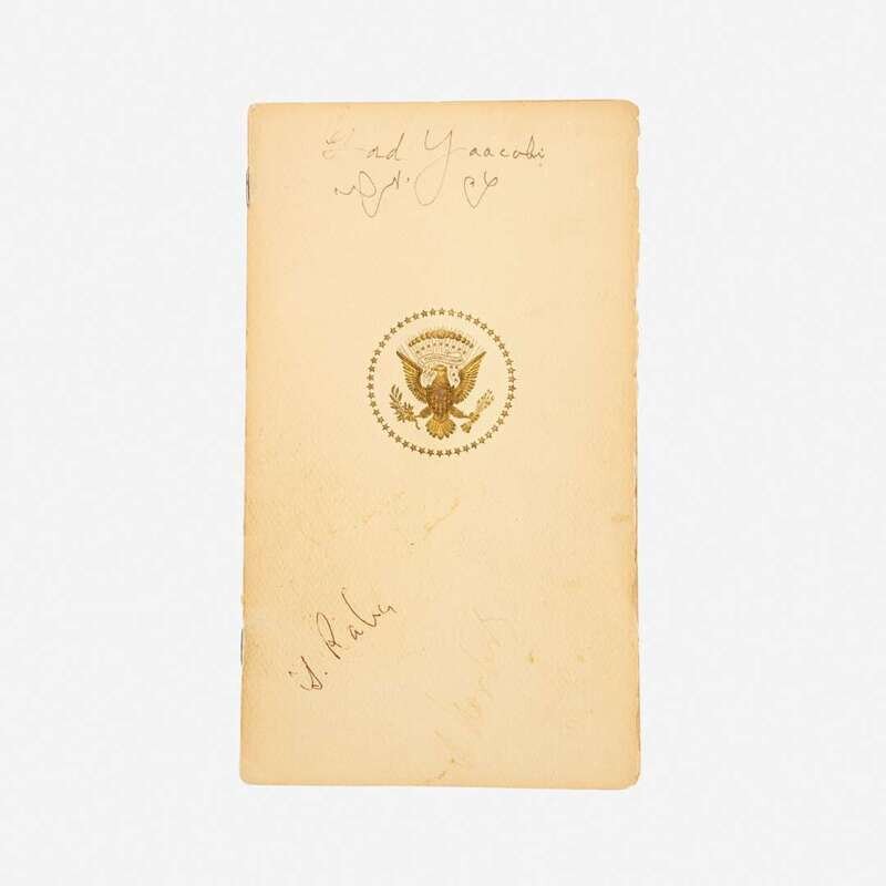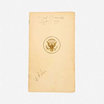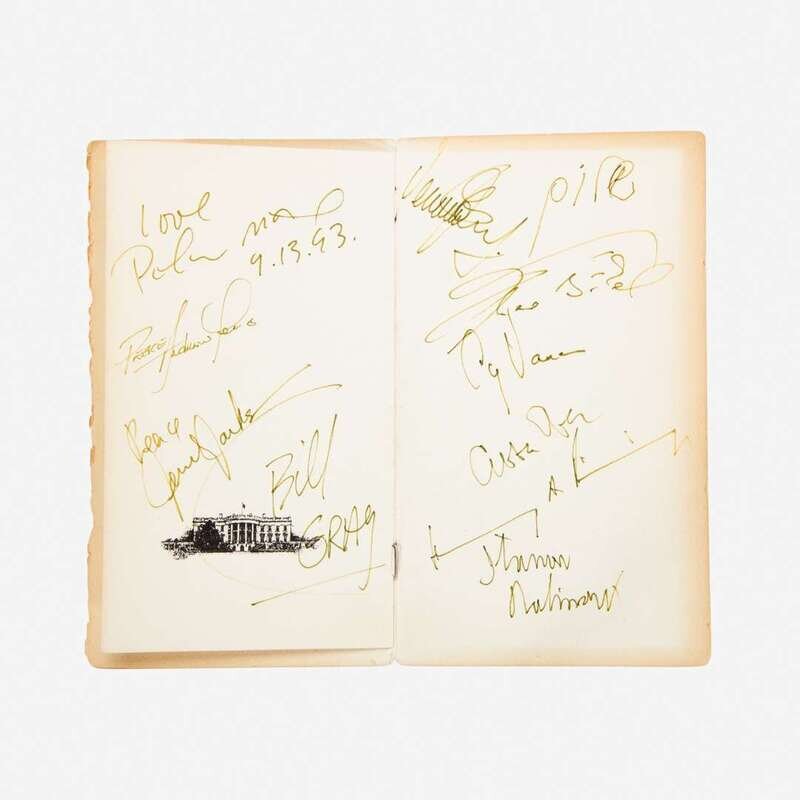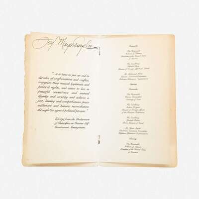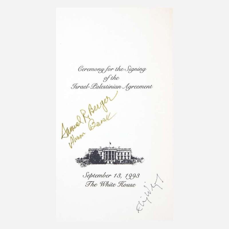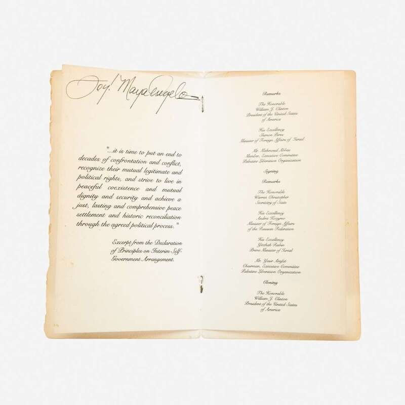 (Washington, D.C.): The White House, September 13, 1993. 8vo. (4) pp. Original stiff wrappers, stamped with the Great Seal of the U.S. on front wrapper, toned. Signed by Yitzhak Rabin (Prime Minister of Israel); Shimon Peres (Minister of Foreign Affairs of Israel, faded); Gad Yaacobi (Israel’s Ambassador to the United Nations); Samuel R. (Sandy) Berger (National Security Advisor to President Clinton); Aharan Barak (President of the Supreme Court of Israel); Elie Wiesel (writer, activist, Nobel Prize winner); William H. (Bill) Gray III (U.S. member of Congress from Pennsylvania); Cyrus (Cy) Vance Jr. (American Secretary of State); Andrew Young (American diplomat and politician); Andrey Kozyrev (Minister of Foreign Affairs of the Russian Federation); Abba Eban (Israeli diplomat and politician); Maya Angelou (writer, poet); Peter Max (artist, commisioned by the White House to paint a piece commemorating the event); Gordon Parks (Photographer, film director, activist), and six unidentified others.