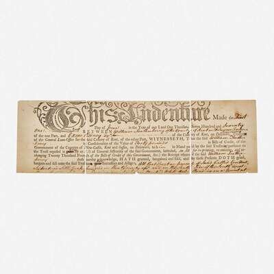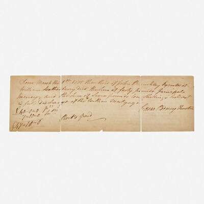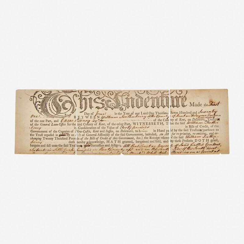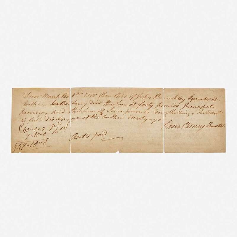 Kent County, Delaware, June 1, 1771. 3 1/8 x 10 in. (79 x 254 mm). Partially-printed indenture, between American Founding Father, Caesar Rodney, and William Leatherberry, for land in Mill Creek, Kent County, Delaware; annotation and signature on verso completely in Rodney's hand, indicating payment in full of 40 pounds principal, dated March 1st 1775, Dover, Delaware. Separated in three pieces along original folds; presumed remnant from a larger document, lacking upper and lower portions, but with no loss to Rodney's annotations on verso.