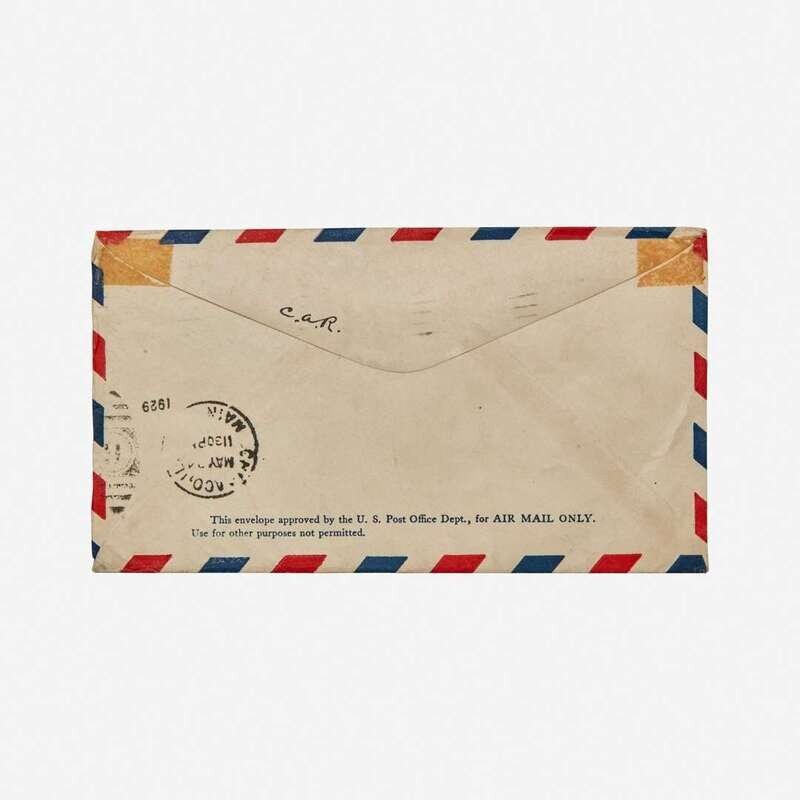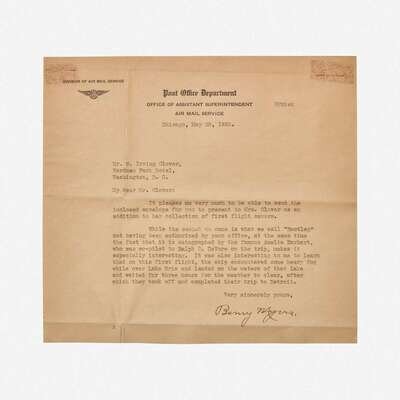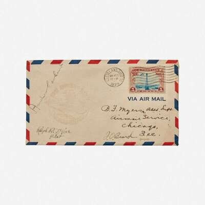 Cleveland to Detroit, May 15, 1929. Air mail envelope, signed by Earhart and co-pilot Ralph E. DeVore, commemorating "First Amphibian Flight over Lake Erie...Cleveland-Detroit"; co-signed by J.O. Beard; postmarked Cleveland, Ohio, May 15, 1929; 5 cent stamp; Chicago, Illinois cancellation on verso; envelope made out to Assistant Superintendent Benny Myers of the Air Mail Service, Post Office Department; mounting residue top corners verso. Lot includes a typed letter, signed by Myers, to W. Irving Glover, Second Superintendant of the Post Office, gifting it to Glover's wife, and recounting a story about Earhart's flight: 'It was also interesting to me to learn/that on this first flight, the ship encountered some heavy fog/while over Lake Erie and landed on the waters of that lake/and waited for three hours for the weather to clear, after/which they took off and completed their trip to Detroit"; mounting residue on verso; opened. 7 1/4 x 8 in. (184 x 203 mm).