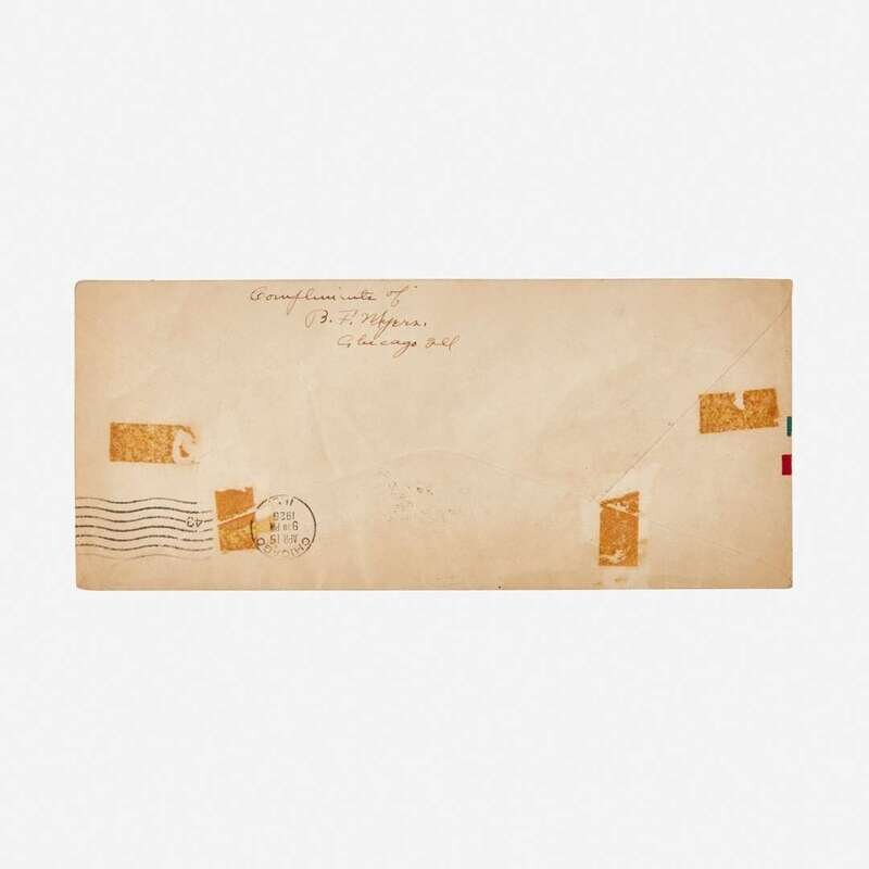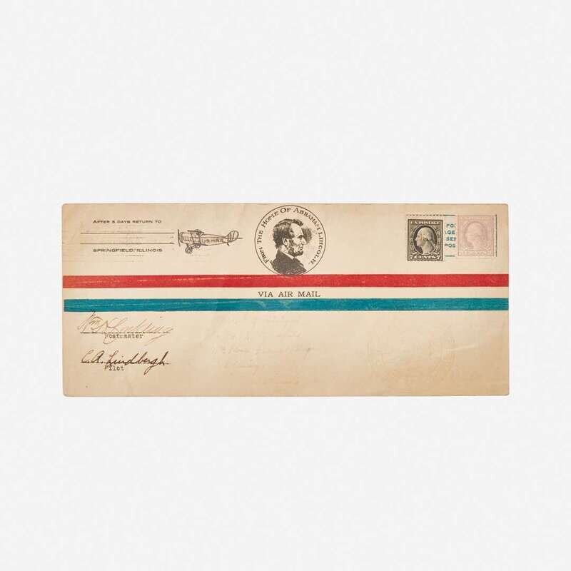Chicago to St. Louis, April 15, 1926. Air Mail envelope, signed by Lindbergh on front, for the inaugural air mail flight from Chicago to St. Louis; co-signed by Postmaster William H. Conkling; including a doodle of a U.S. Mail plane at top in an unknown hand. Mounting residue on verso; opened. 4 1/16 x 9 1/2 in. (103 x 241 mm).