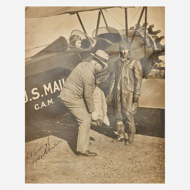 An early signed photograph, featuring Lindbergh (in plane) during his time working for the Robertson Aircraft Corporation (RAC). Lindbergh joined the RAC after graduating from Army Flight School in 1925, and flew air mail service flights from St. Louis to Chicago, beginning on April 15, 1926 and continuing until mid-1927, before departing for California to oversee the design of the Spirit of St. Louis.