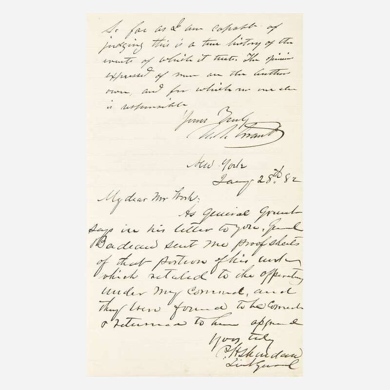 - Autograph letter, signed by U.S. General Philip H. Sheridan, to Work, on same page directly below above letter: “My dear Mr. Work/As General Grant/says in his letter to you, General/Badeau sent me proof sheets/of that portion of his work/which related to the opperating (sic)/under my command, and/they were found to be correct/& returned to him approved”/Yours truly/P.H. Sheridan/Lieut General”, dated January 28, 1882.