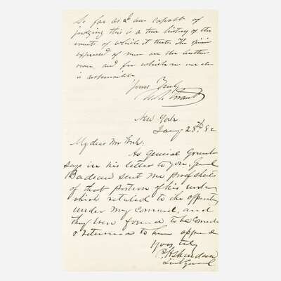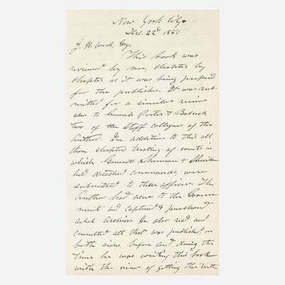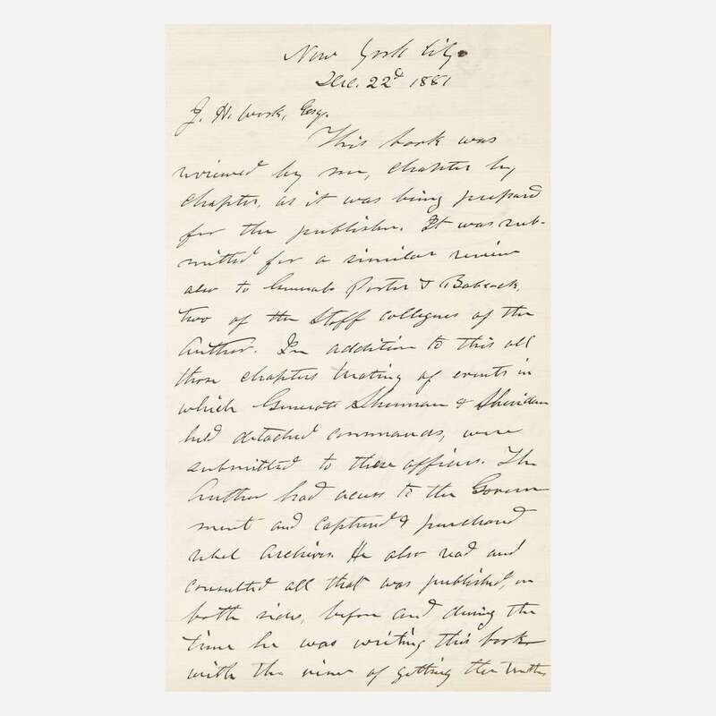 - Autograph letter, signed by Ulysses S. Grant, to J.H. Work: “This book was/reviewed by me, chapter by/chapter, as it was being prepared/for the publishers. It was sub-/mitted for a similar review/also to Generals Porter & Babcock,/two of the staff colleagues of the/Author. In addition to this all/those chapters treating of events in/which Generals Sherman & Sheridan/held detached commands, were/submitted to those officers. The/Author had access to the Govern/ment and captured & purchased/rebel archives. He also read and/consulted all that was published, on/both sides, before and during the/time he was writing this book/with the view of getting this truth./So far as I am capable of/judging this is a true history of the/events of which it treats. The opinions/expressed of men are the Authors/own, and for which no one/is responsible./Yours truly,/U.S. Grant”, dated December 22, 1881.