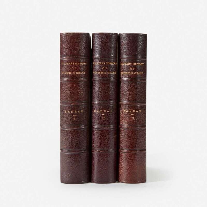 New York: D. Appleton and Company, 1881. In three volumes. First edition. 8vo. (xviii), xiii, (iii), 683; x, (ii), 591; ix, (iii), 733 pp. Illustrated with an engraved portrait frontispiece of Grant in first volume; lacking all, but one, of the engraved maps and plates. Contemporary full brown morocco, as described in Badeau's letter below, stamped in blind and in gilt; top edges gilt, other edges trimmed; marbled endpapers; gift inscription from Work to his father, John C. Work, dated Christmas 1881, on first free leaf in first volume; all three volumes partially unopened; bookseller's ticket of Henry Miller, Bookseller & Binder 82 Nassau St. N.Y. on rear paste-down of each volume.