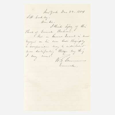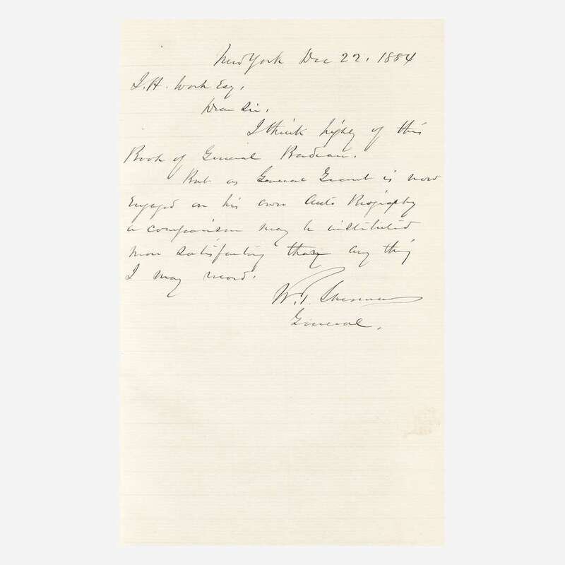 - Autograph letter, signed by U.S. General William Tecumseh Sherman on following page: “J.H. Work Esq,/Dear sir,/I think highly of this/Book of General Badeau./But as General Grant is now/engaged on his own Auto Biography/a comparison may be ____/more satisfactory than any thing/I may record./W.T. Sherman/General.”, dated December 22, 1884.