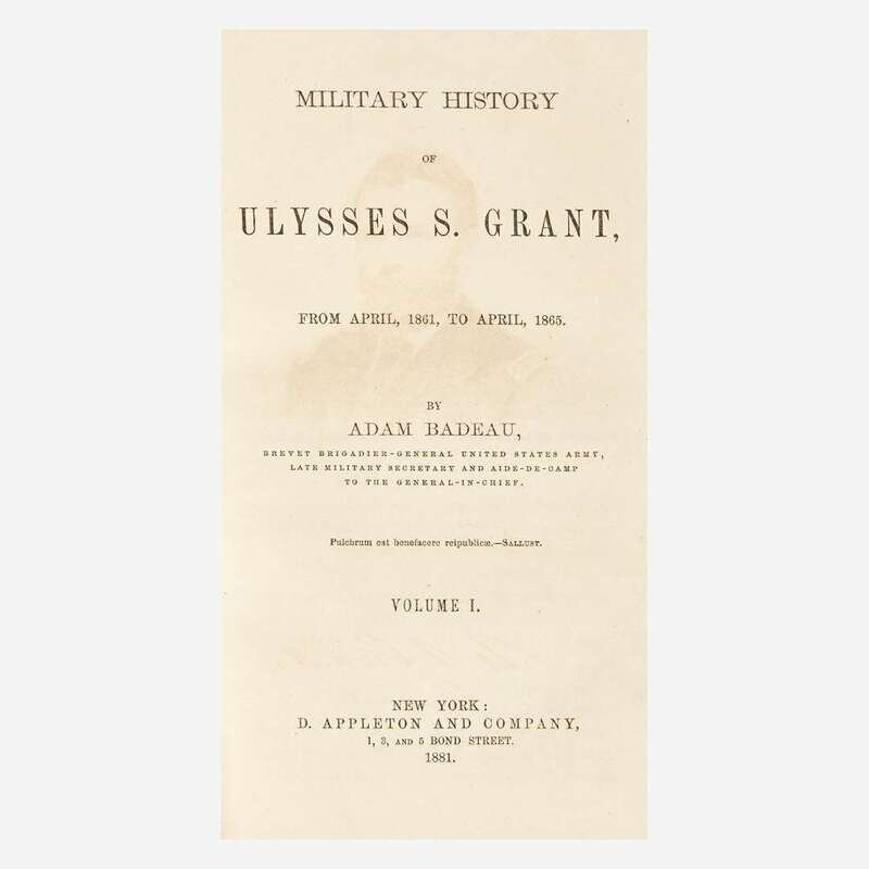 In Badeau's Grant in Peace (1887, chapter 51, p. 588) he writes of this very set: "Mr. Work had a copy of my Military History of Grant especially bound for his library, and asked General Grant to write something in it to attest his opinion of its merits..." Badeau also used portions of Grant's above letter when promoting the 1885 reprint of this work by Appleton.