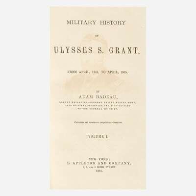 An extraordinary and unique set of Adam Badeau's three-volume military history of Ulysses S. Grant, with three autograph letters from the most prominent Union Army Generals: Ulysses S. Grant (1822-85), William Tecumseh Sherman (1820-91), and Philip H. Sheridan (1831-88), bound in. Grant wrote his own autobiography, published with the aid of his friend Mark Twain shortly after Grant's death in 1885. Badeau also worked with Grant during the early stages of his own memoir, Personal Memoirs of U.S. Grant (New York: Charles L. Webster & Company, 1885-86), before leaving the project over a financial dispute.