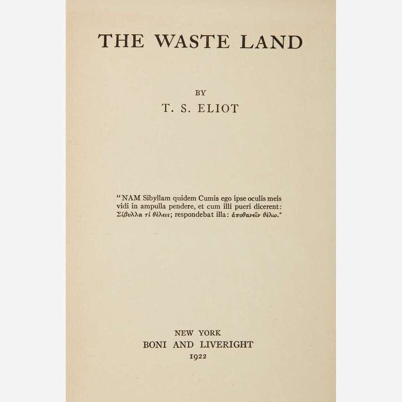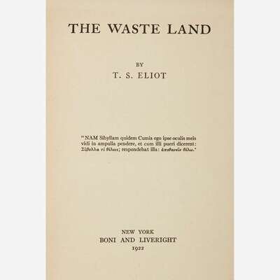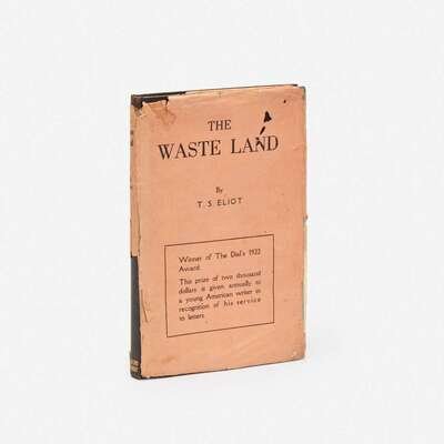 New York: Boni and Liveright, 1922. First edition, second issue (with 2 mm rubber stamp on colophon, "water" spelled correctly on p. 22, "mountain" spelled without "a" in line 339, p. 41), #738/1,000 copies. Original stiff black cloth, stamped in gilt; all edges untrimmed; ownership signature on front paste-down; newspaper clippings mounted on front paste-down, verso of front free endpaper, and rear endpaper, offsetting from same on front free endpaper, half-title, and rear paste-down; offsetting on copyright page and second half-title; underlining in pencil on pp. 29-32; in original first state salmon dust-jacket (with periods after both sentences in the boxed announcement on front panel), worn, lettered in black, lower spine panel perished, front panel hinge reinforced, soiling and three open tears at head of front panel, chip at bottom rear panel, inscription in ink at top of same, creasing to front flap edge. Gallup A6a.