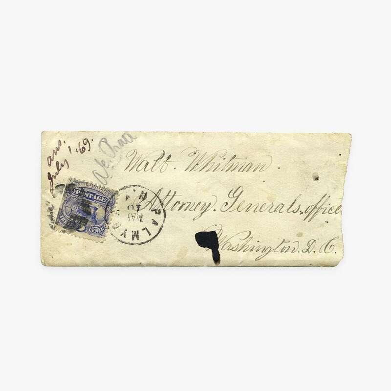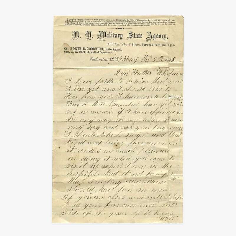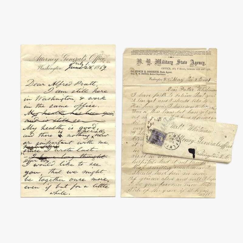 Williamson Wayne Co., N.Y., May 1, 1869. 2 pp.; 7 7/8 x 5 (200 x 127 mm). Autograph letter signed by Pratt to Whitman, on N.Y. Military State Agency stationery, writing to inquire about his health, and to catch him up on personal matters: "Dear Father Whitman, I have faith to beleive (sic) that you're a live yet and I should like to Hear from you..."; with original postal envelope. Creasing from orignal folds.