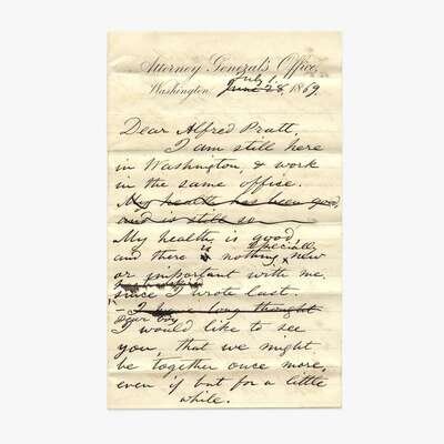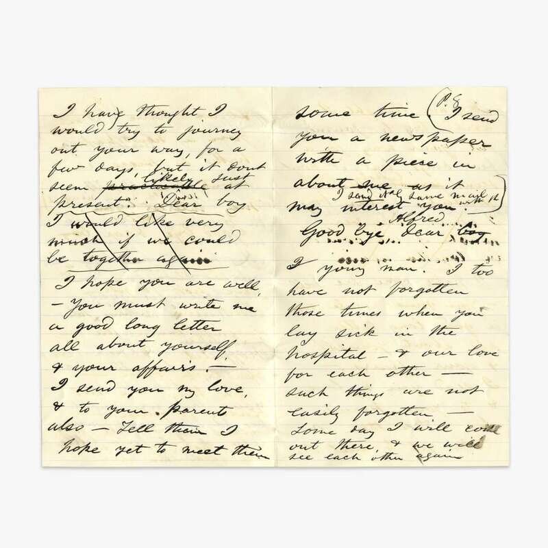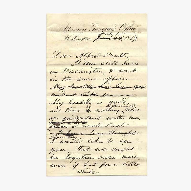 Washington, (D.C.), July 1, 1869. One sheet folded to make 4 pp.; 8 x 5 in. (203 x 127 mm). Draft of an intimate autograph letter by Whitman, unsigned, on Attorney General's Office lined stationery, to friend and Civil War soldier, Alfred Pratt: "I am still in here in Washington, & work in the same office. My health is good, and there is nothing specially new or important with me since I wrote last. Dear boy I would like to see you, that we might be together once more, even if but for a little while. I have thought I would try to journey out your way, for a few days, but it don't seem likely just at present. Dear boy I hope you are well,--you must write me a good long letter all about yourself & your affairs.--I send you my love, & to your parents also--Tell them I hope yet to meet them some time...I too have not forgotten those times when you lay sick in the hospital--& our love for each other--such things are not easily forgotten--Some day I will come out there, & we will see each other again." Numerous emendations in Whitman's hand (most of which included in the finished letter); creasing from original folds.