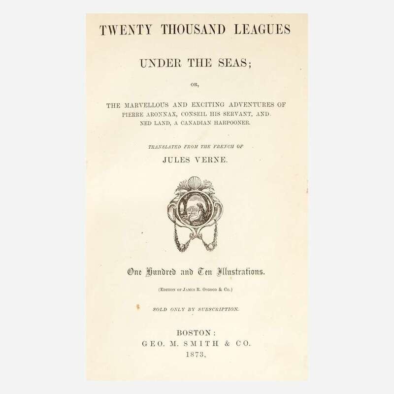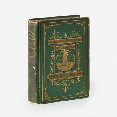 Boston: Geo. M. Smith & Co., 1873. First American edition, second printing (without "The End" at bottom of p. 303). 8vo. xiii, (iii), 303 pp. Illustrated with engraved frontipiece and numerous engraved plates. Original green pictorial cloth, stamped with Captain Nemo holding a sextant in gilt on front board, lettered in black and in gilt, spine darkened, spine ends worn, cloth split on same, bottom front board joint splitting, corners worn; all edges trimmed; front and rear hinges lightly worn; Contemporary gift inscription on second free leaf; ownership signature on title-page; scattered light spotting; book-plate of surgeon Dr. J. Chalmers DaCosta on front free endpaper, another book-plate on same. Myers 56.