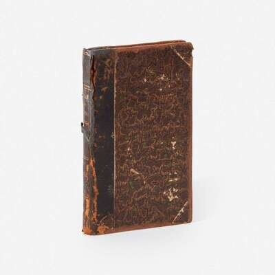 Philadelphia: James Humphrey, 1802. First American edition. 32mo. 97, (1), (8) (ads) pp. Illustrated with engraved frontispiece. Quarter brown leather, over marbled paper-covered boards, stamped in gilt, extremities worn, joints, spine, and boards rubbed; frontispiece repaired; title-page repaired and dampstained, ownership ink stamp at bottom of same, as well as pp. (5) and 51; text leaves unevenly toned; worming bottom p. 85/86 scattered minor to moderate spotting. Ford, p. 159.