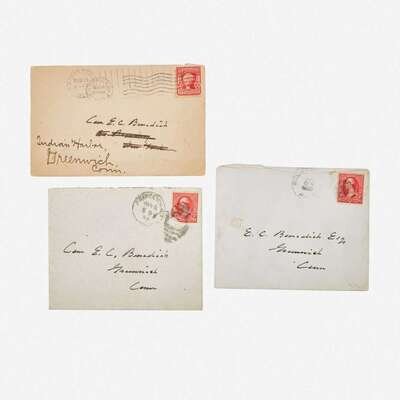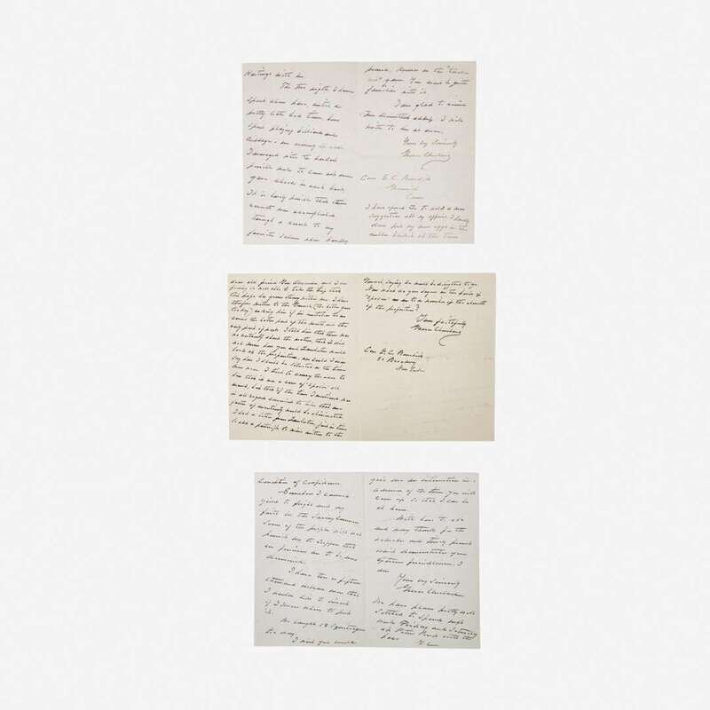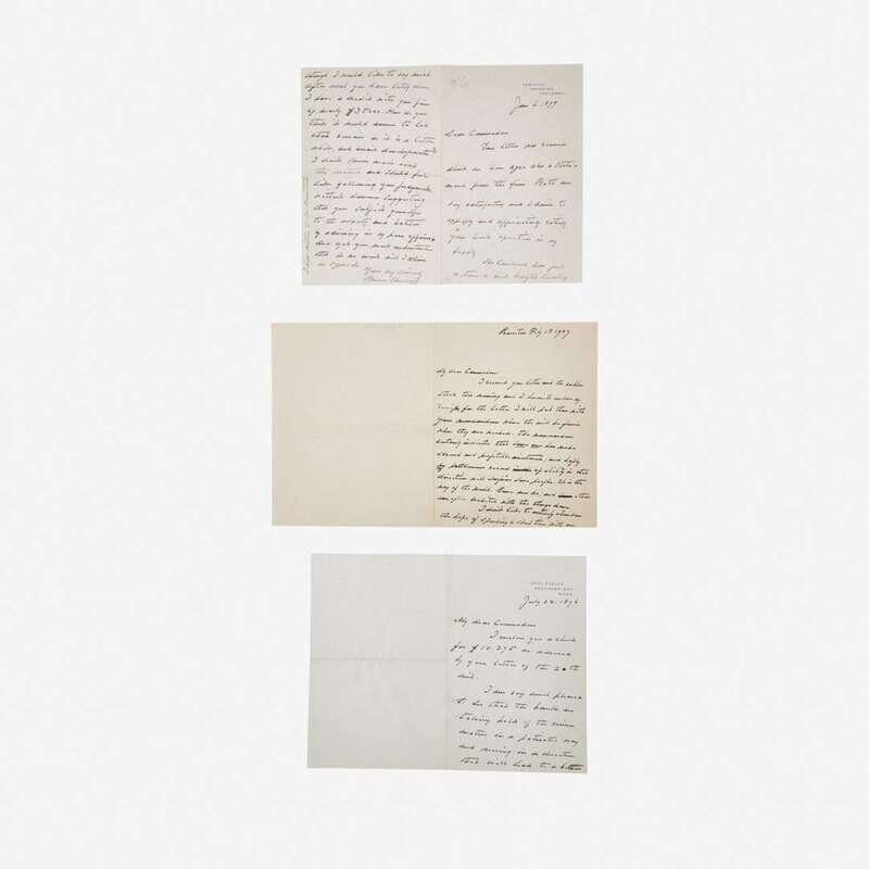 Princeton, (New Jersey), Feb. 15, 1907. One sheet folded to make 4 pp.; 6 1/2 x 5 1/2 in. (165 x 140 mm). Autograph letter, signed by Cleveland, to E.C. Benedict, concerning financial matters: "I received your letter and the rubber/stocks this morning and I here enclose my/receipt for the latter. I will put them with/your memorandum where the (sic) will be found/when they are needed. The memorandum/certainly indicates that some one has made/shrewd and profitable investments; and haply/my posthumous record of ability in that/direction will surprise some people. This is the/way of the world. Some men do; and others/are often credited with the things done."; with original signed envelope. Creasing from original folds. Includes clipped engraved portrait of Cleveland.