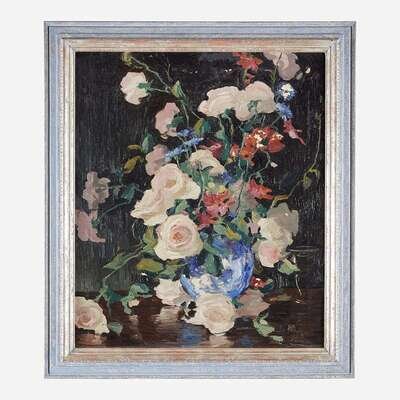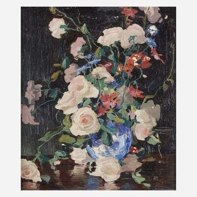 Jonas Lie (American/Norwegian, 1880–1940) Still Life with Roses, Poppies and Cornflowers in a Blue Porcelain Vase