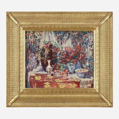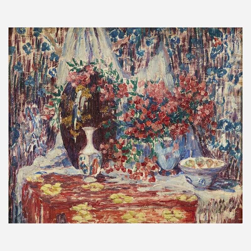 Maude Drein Bryant (American, 1880–1946) Still Life with Flowers, Vases and Bowls on a Commode Against a Drapery