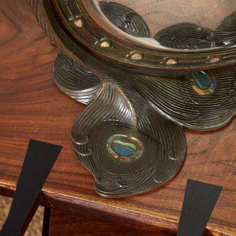 Patinated bronze, leaded favrile glass, mirrored glass.
