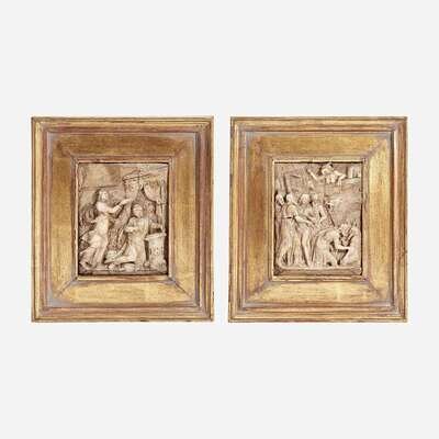 Depicting the Annunciation and a Biblical scene, both with traces of gilding; presented in a giltwood frame. (2).