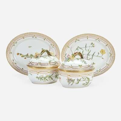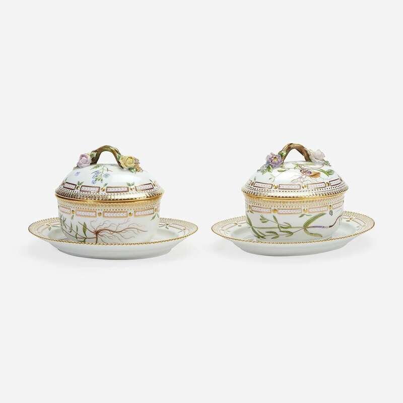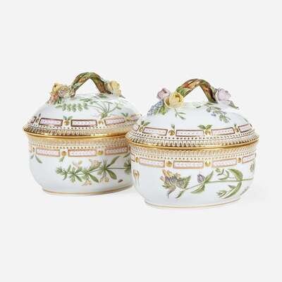 A Pair of Flora Danica Porcelain Small Tureens and Covers and Underplates Modern