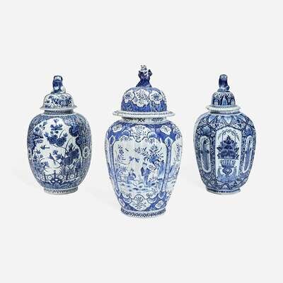Three Dutch Delft Blue and White Jars with Covers 18th/19th century