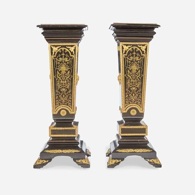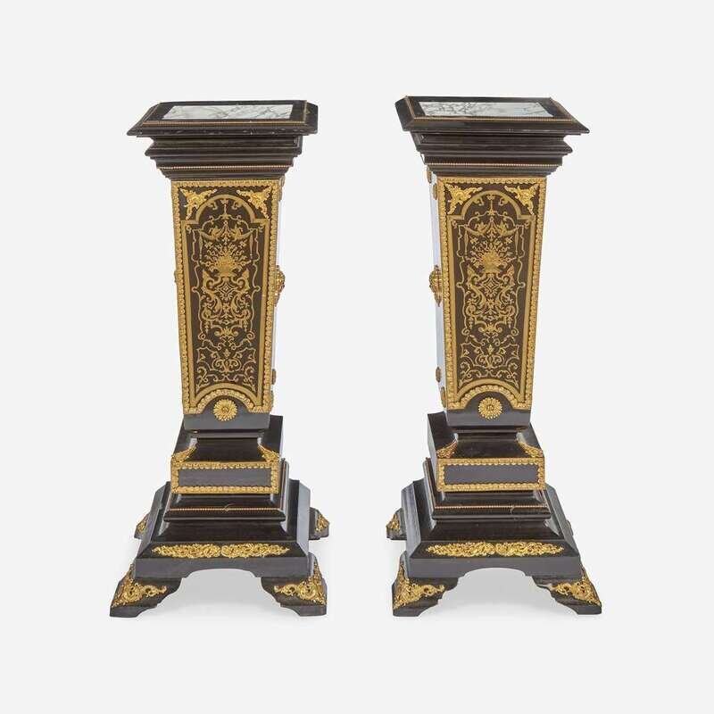 A Pair of Louis XIV Style Boulle Marquetry Inlaid Gilt-Bronze Mounted Ebonized Marble Top Pedestals 20th century