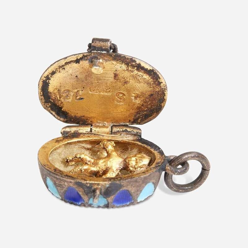 The first depicting a bouquet of flowers set in onyx, the second a butterfly and moth; sold together with a souvenir enameled locket pendant with the Sphinx of Giza, opening to reveal a gilt figure of a baby, early 20th century. (3).