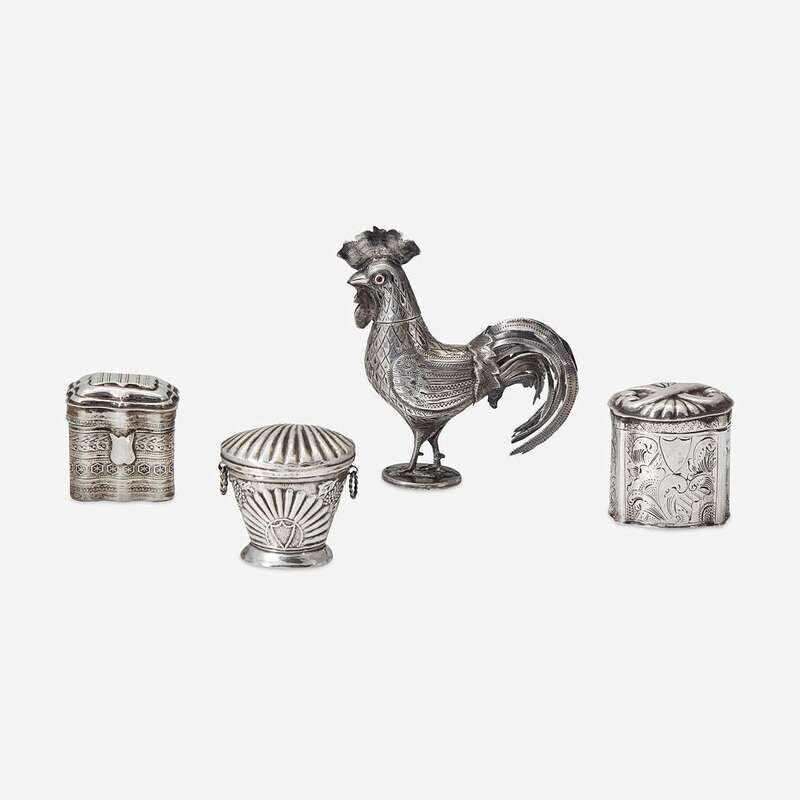 Comprising three Dutch silver hinged boxes, each marked with .833 lion standard mark to undersides, the other marks illegible; and one rooster-form box, marks illegible. (4).