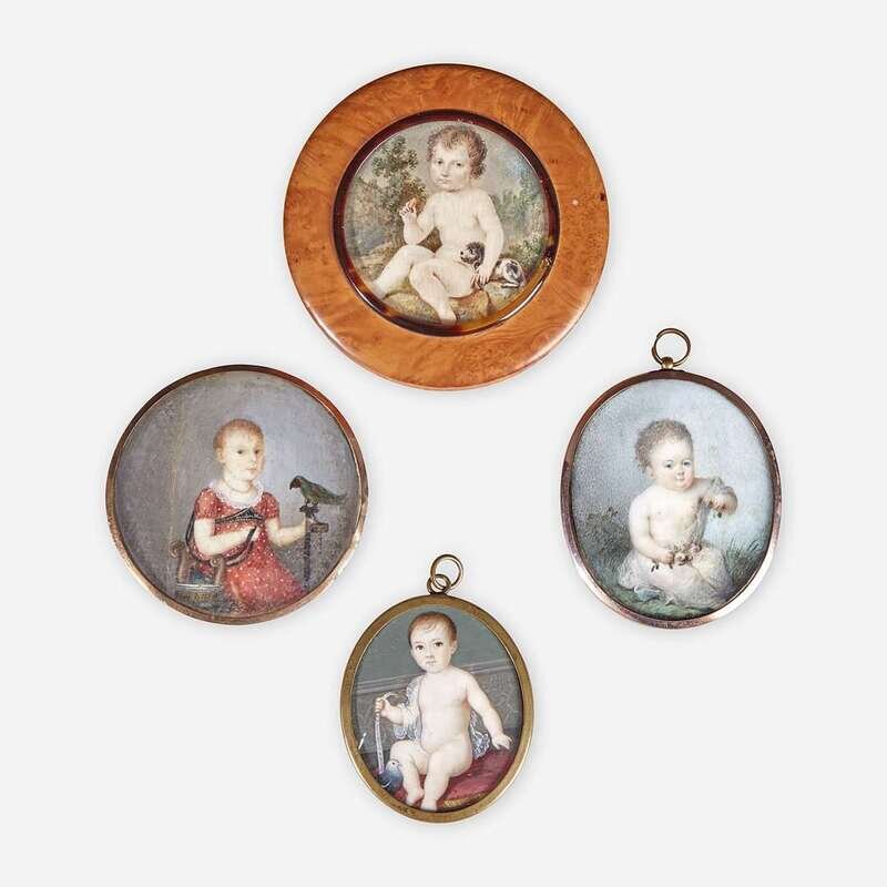 Comprising a portrait of a seated child with floral garland, Continental School, early 19th century, gilt locket case; a portrait of a seated nude child with dove and ribbon inscribed 'Manuel de Dueñas de edad de 2.00,' Spanish School, early 19th century, gilt locket case; a portrait of a seated young girl in red dress with parrot, the chair inscribed 'Piccolo di Meli II,' her cinched waist inscribed, 'Napoleon Meurt,' and signed, l.r., 'Bargellini. F.,' Italian School, early 19th century; and a portrait of a seated young child with dog, mounted to a burlwood and tortoiseshell patch box, Italian School, early 19th century; all watercolor.